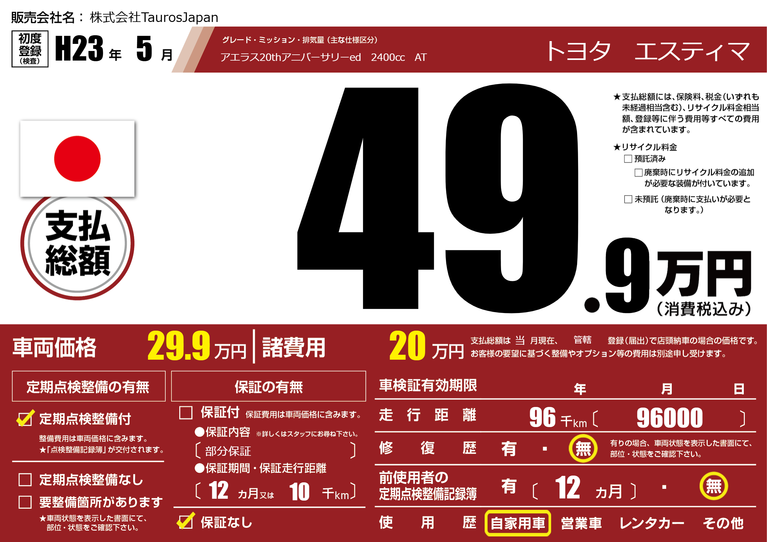 | 走行キロ | 9.6万km | 初年度登録 | H23年5月 |