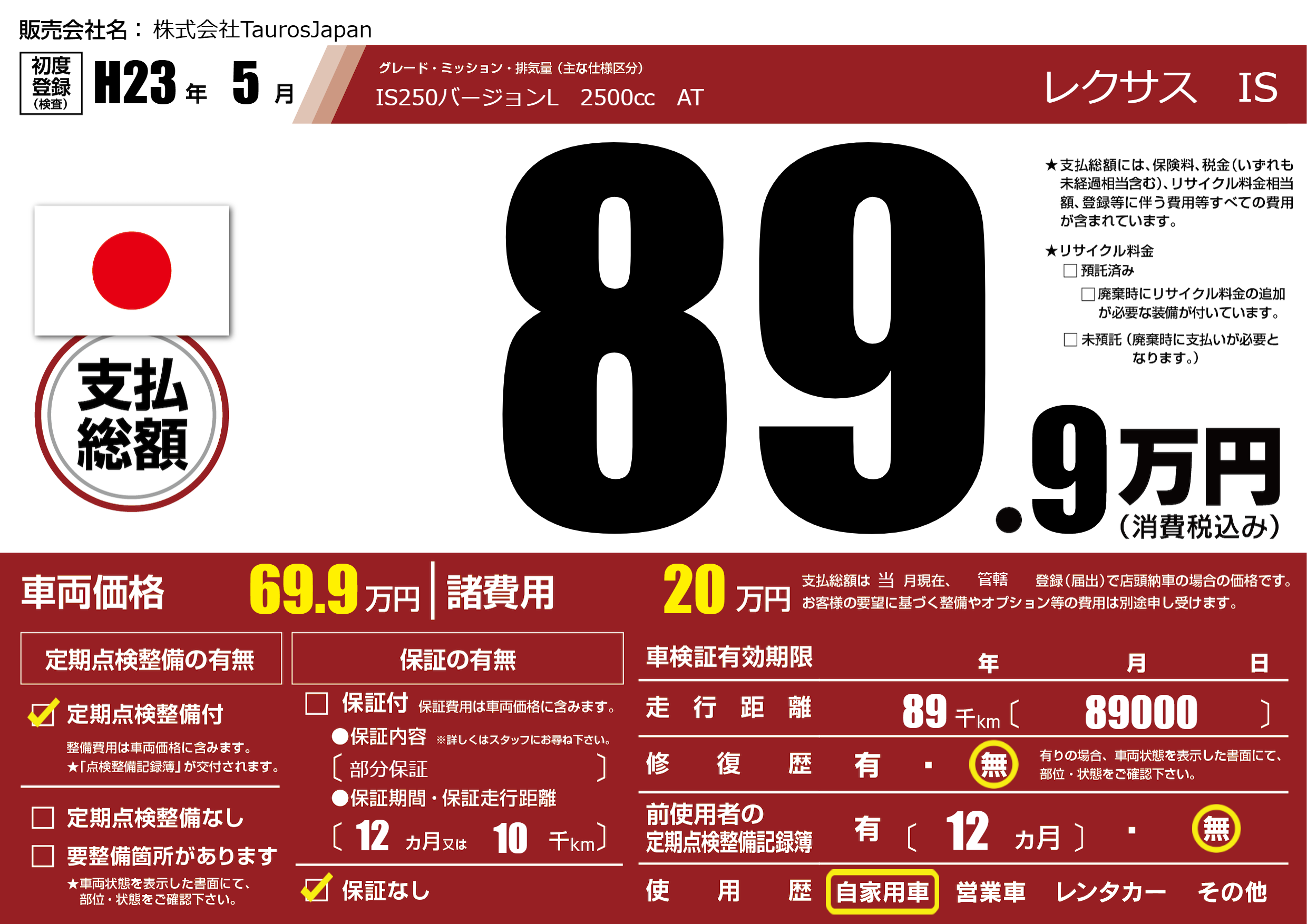 | 車名 | レクサス IS | グレード ミッション 排気量 |