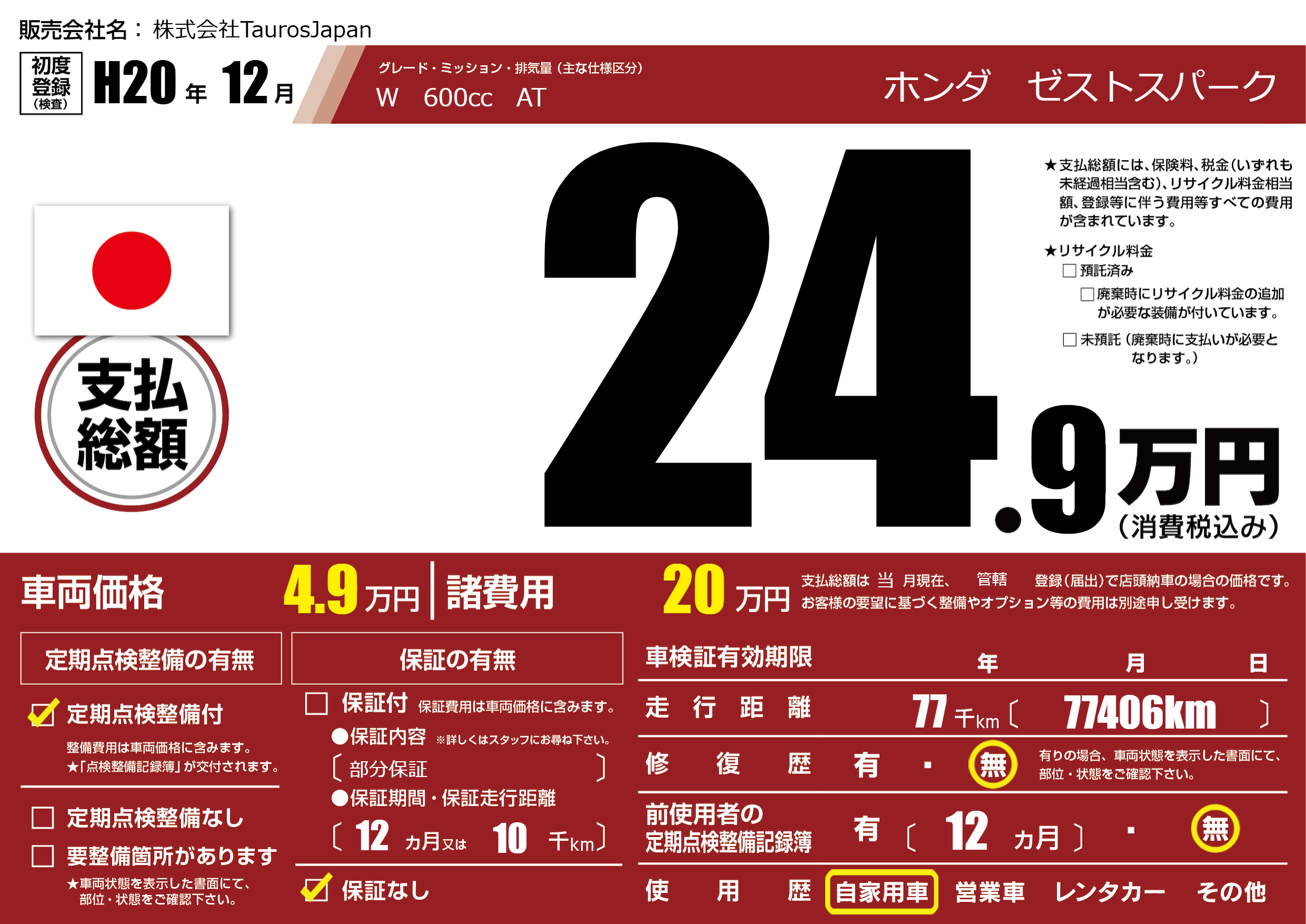 | 車名 | ホンダ ゼストスパーク | グレード ミッション 排気量 |
