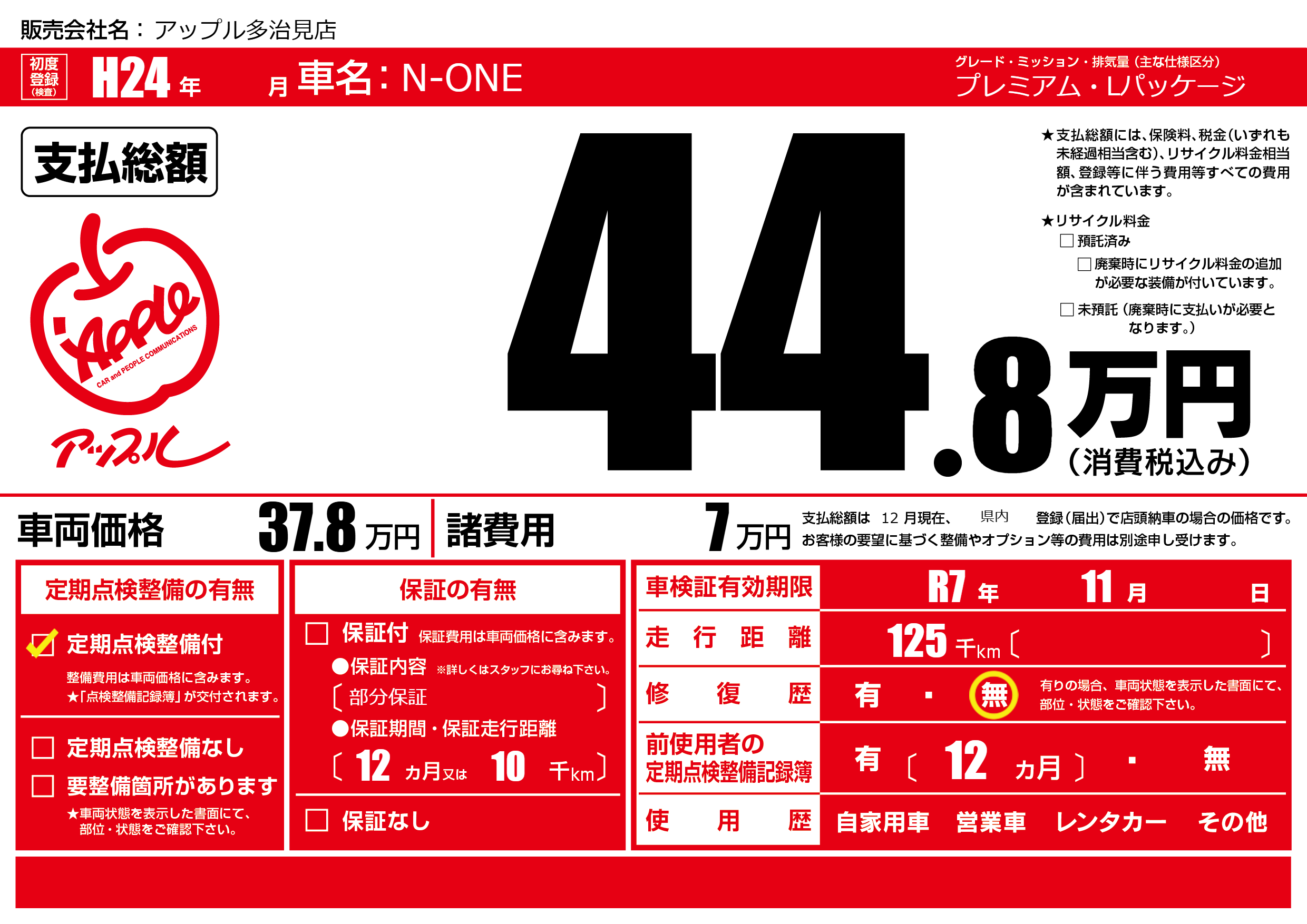 | 車検制限 | R7年 11月 - 日 | ||