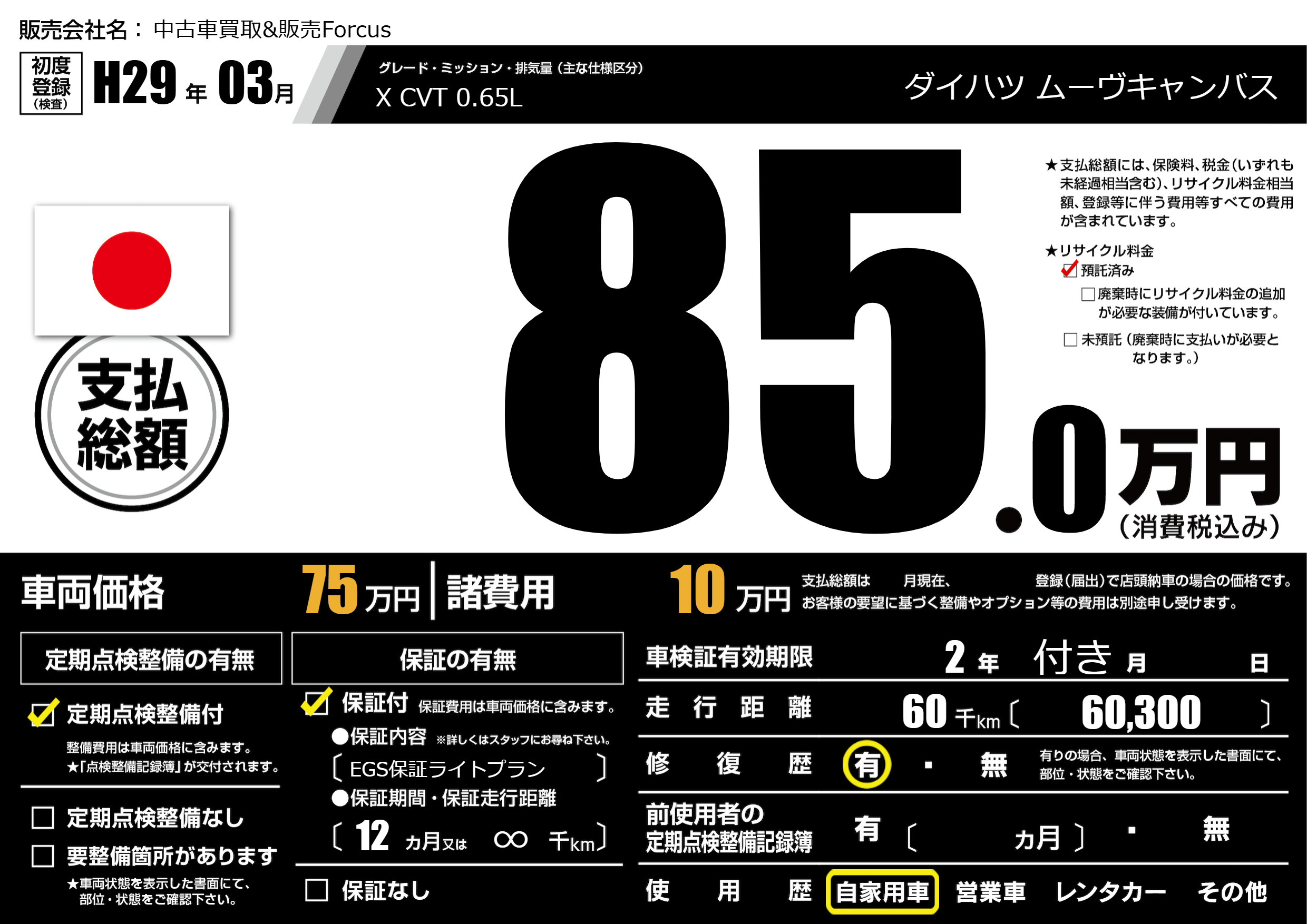 | 車名 | ダイハツ ムーヴキャンバス | グレード ミッション 排気量 |