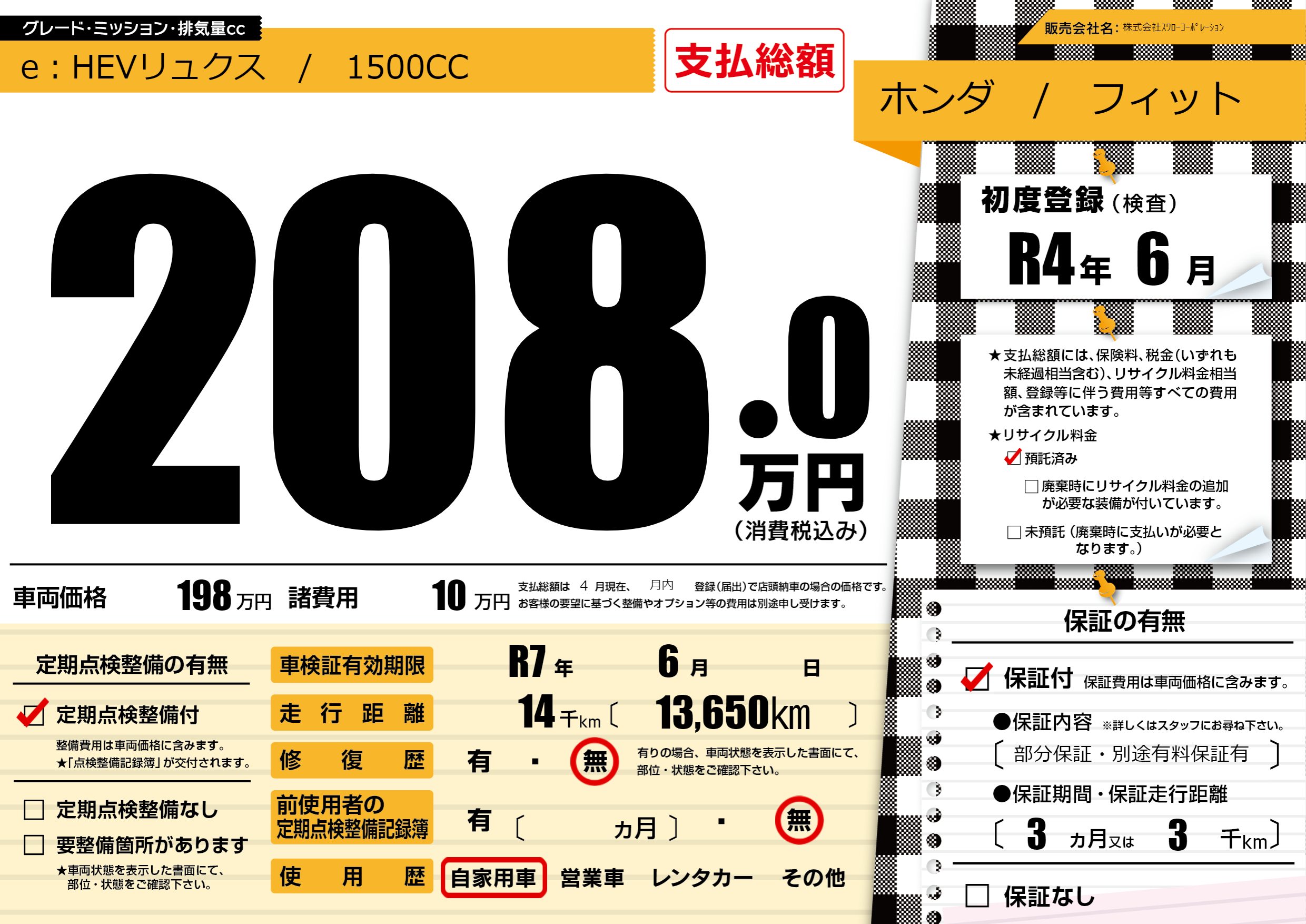 保証付き 保証内容(部分保証・別途有料保証有) 3ヶ月または(3)千kmまで |