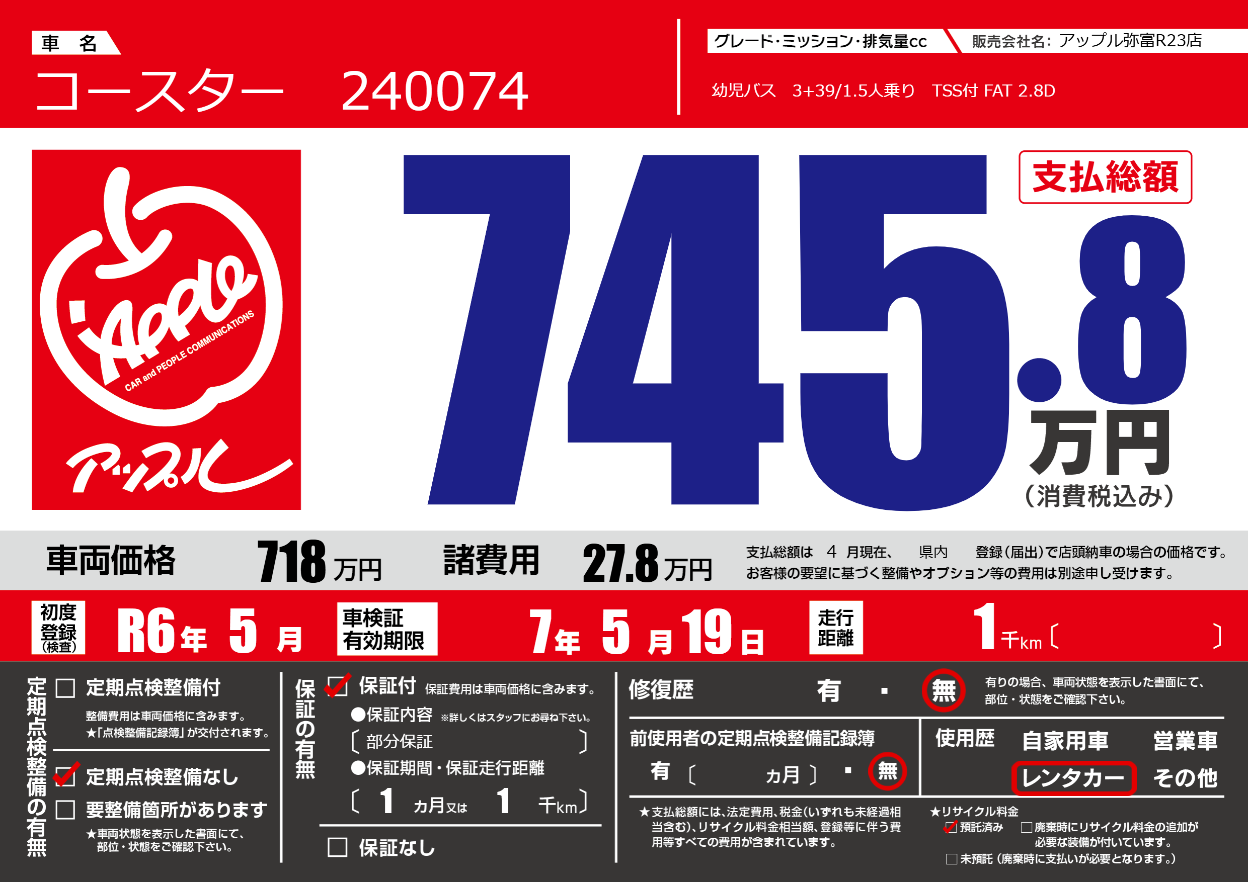 | 車名 | コースター 240074 | グレード ミッション 排気量 |