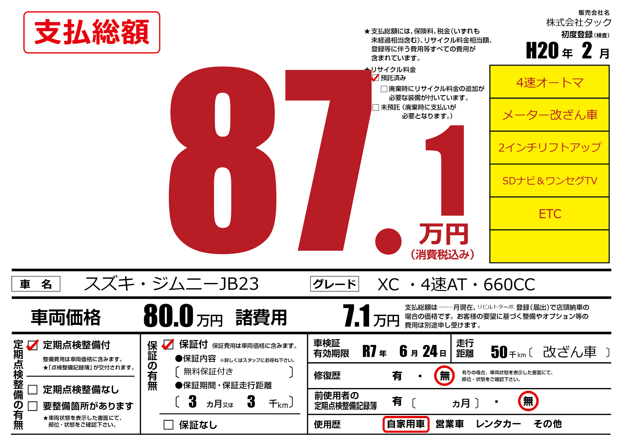 | 車名 | スズキ・ジムニーJB23 | グレード ミッション 排気量 |
