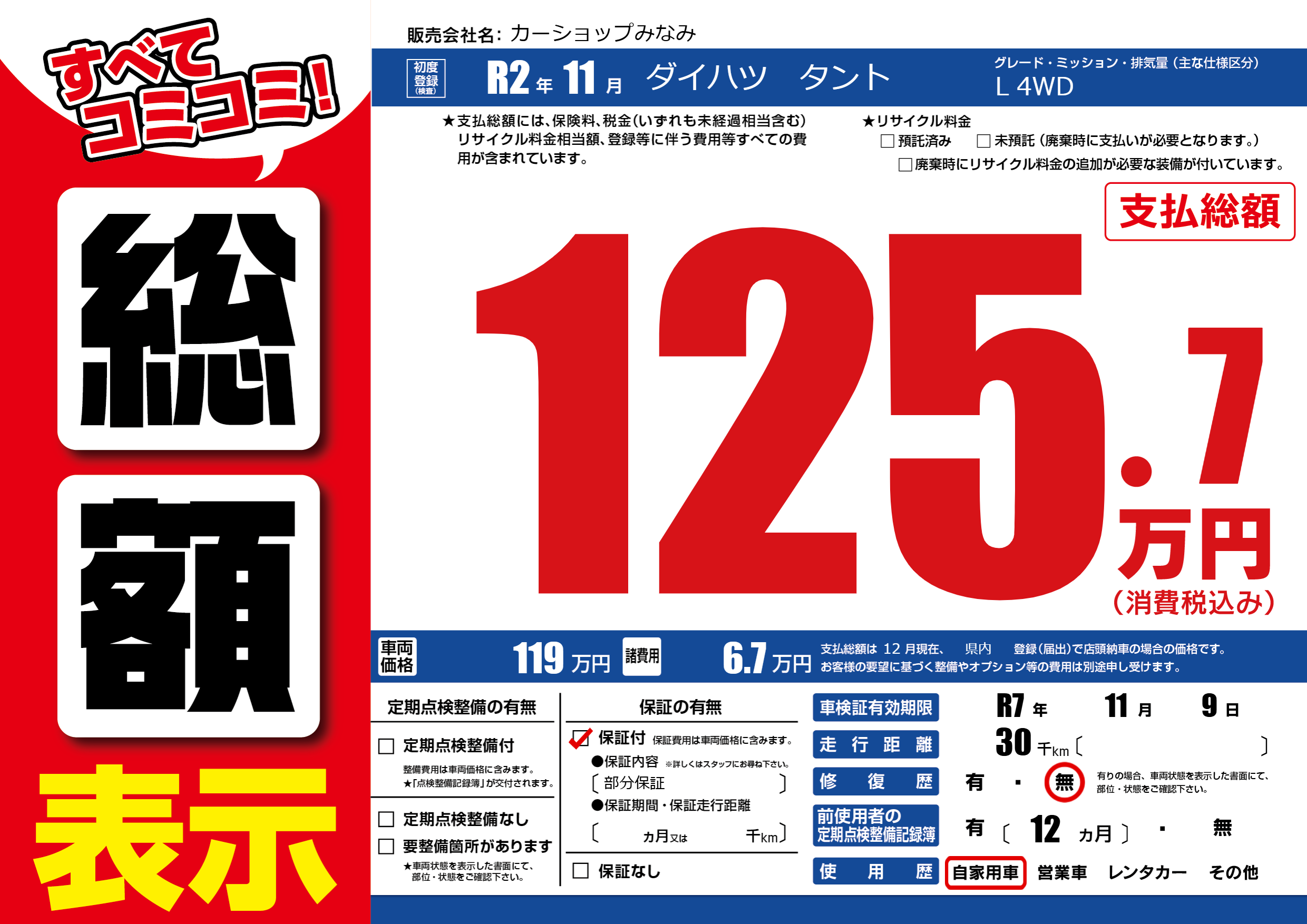 | 走行キロ | 3万km | 初年度登録 | R2年11月 |