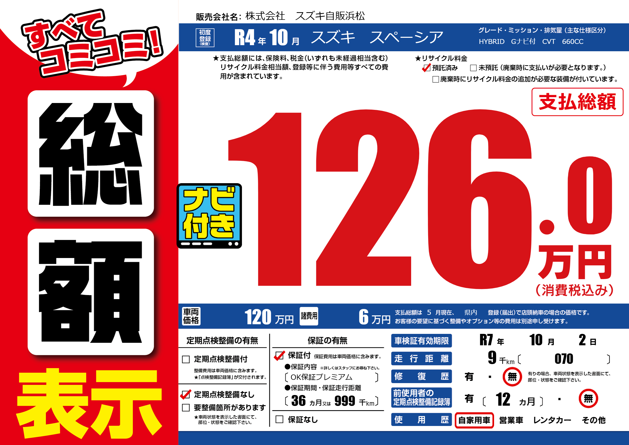 | 走行キロ | 0.9万km | 初年度登録 | R4年10月 |