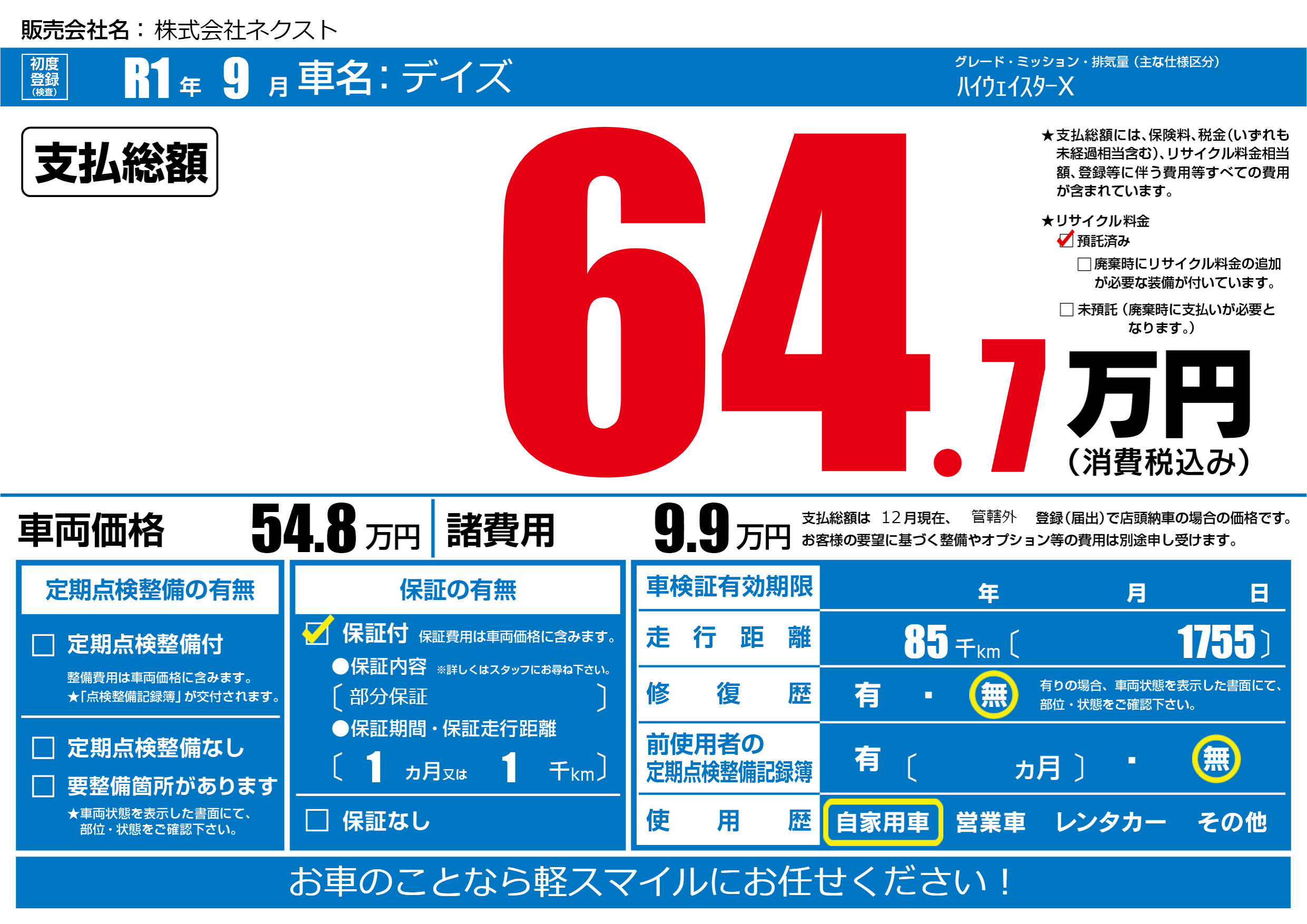 | 車名 | デイズ | グレード ミッション 排気量 |