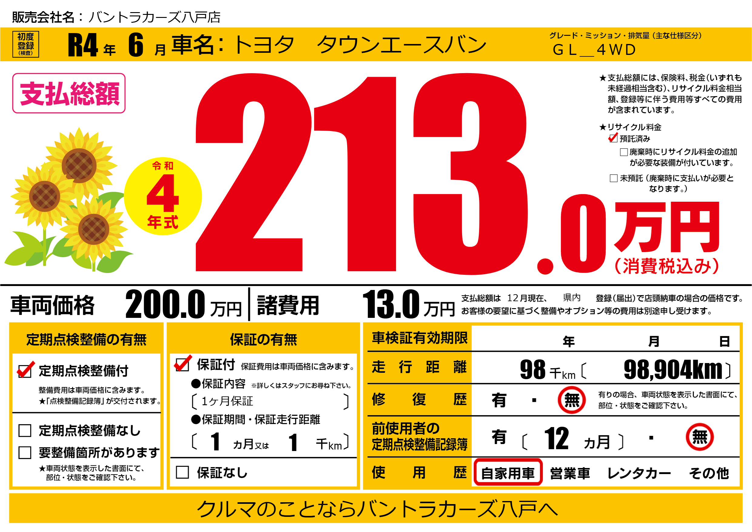 | 車名 | トヨタ タウンエースバン | グレード ミッション 排気量 |