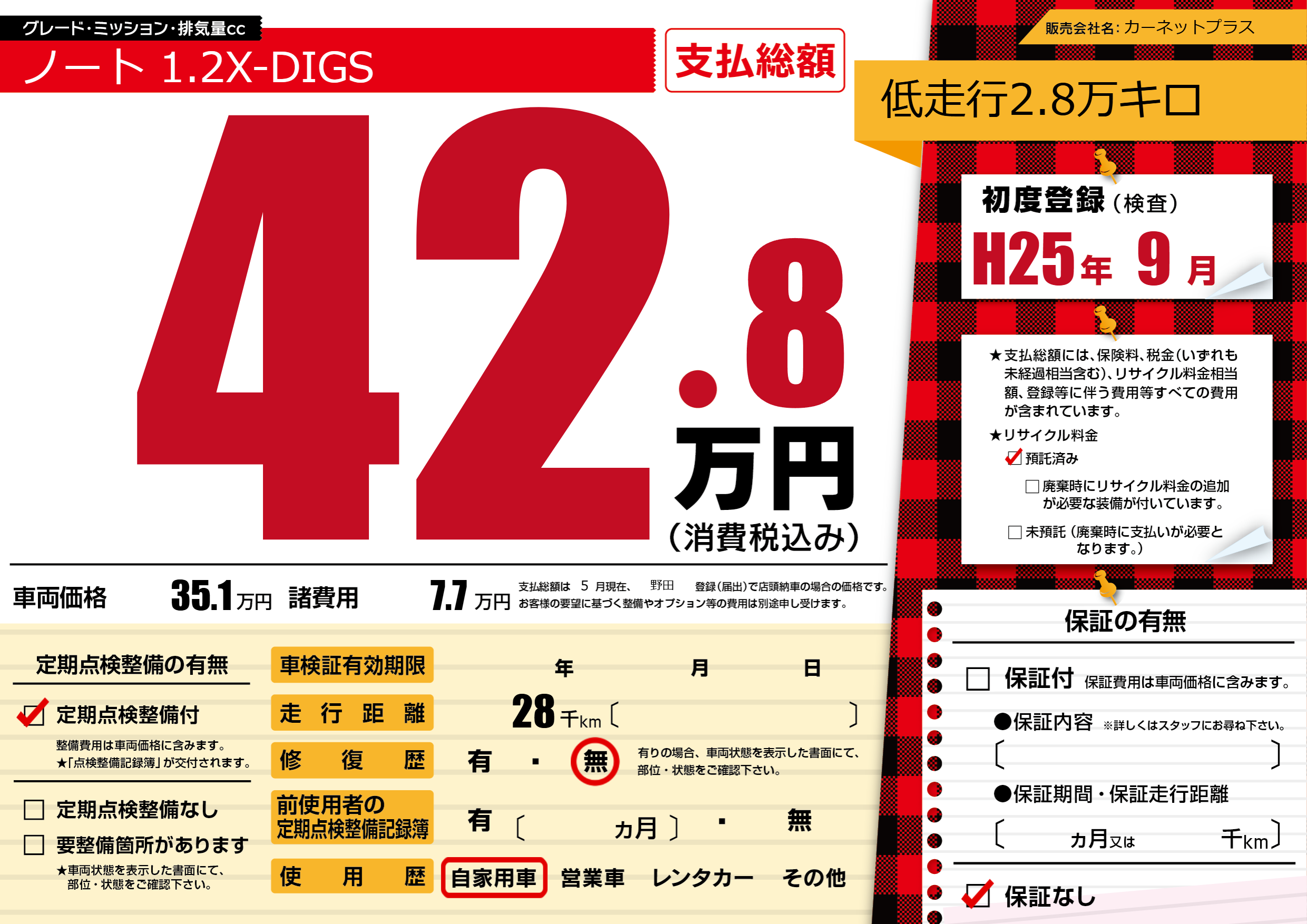 | 走行キロ | 2.8万km | 初年度登録 | H25年9月 |