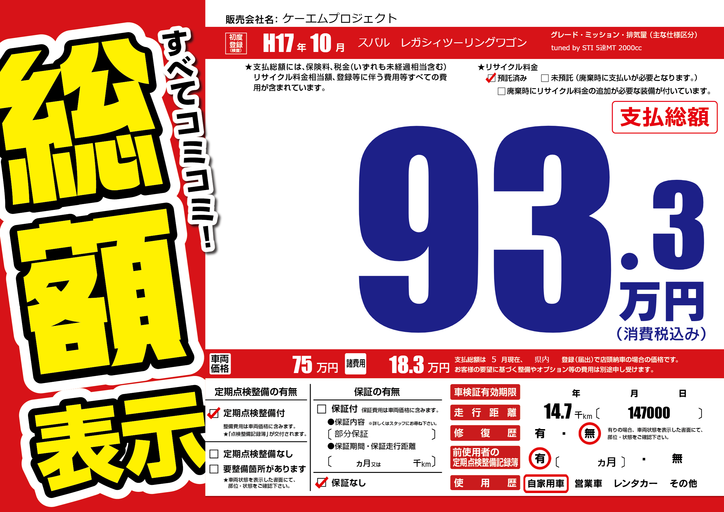 | 車名 | スバル レガシィツーリングワゴン | グレード ミッション 排気量 |