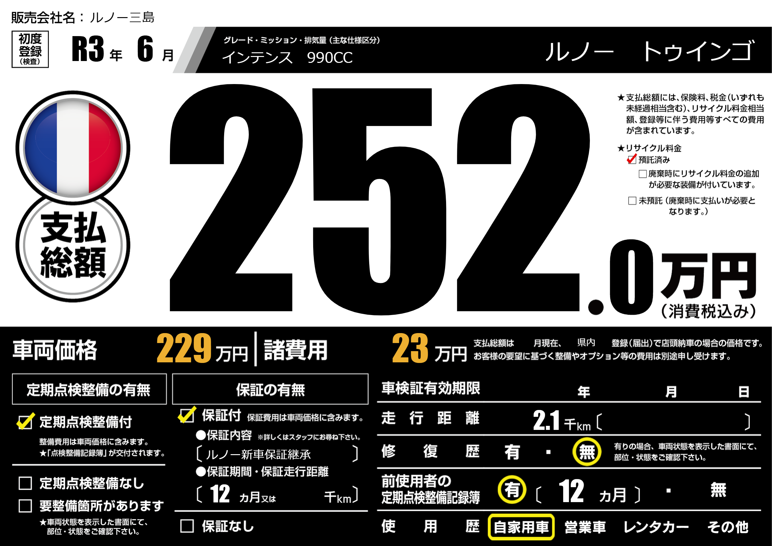 保証なし 保証内容(ルノー新車保証継承) 12ヶ月または千km |