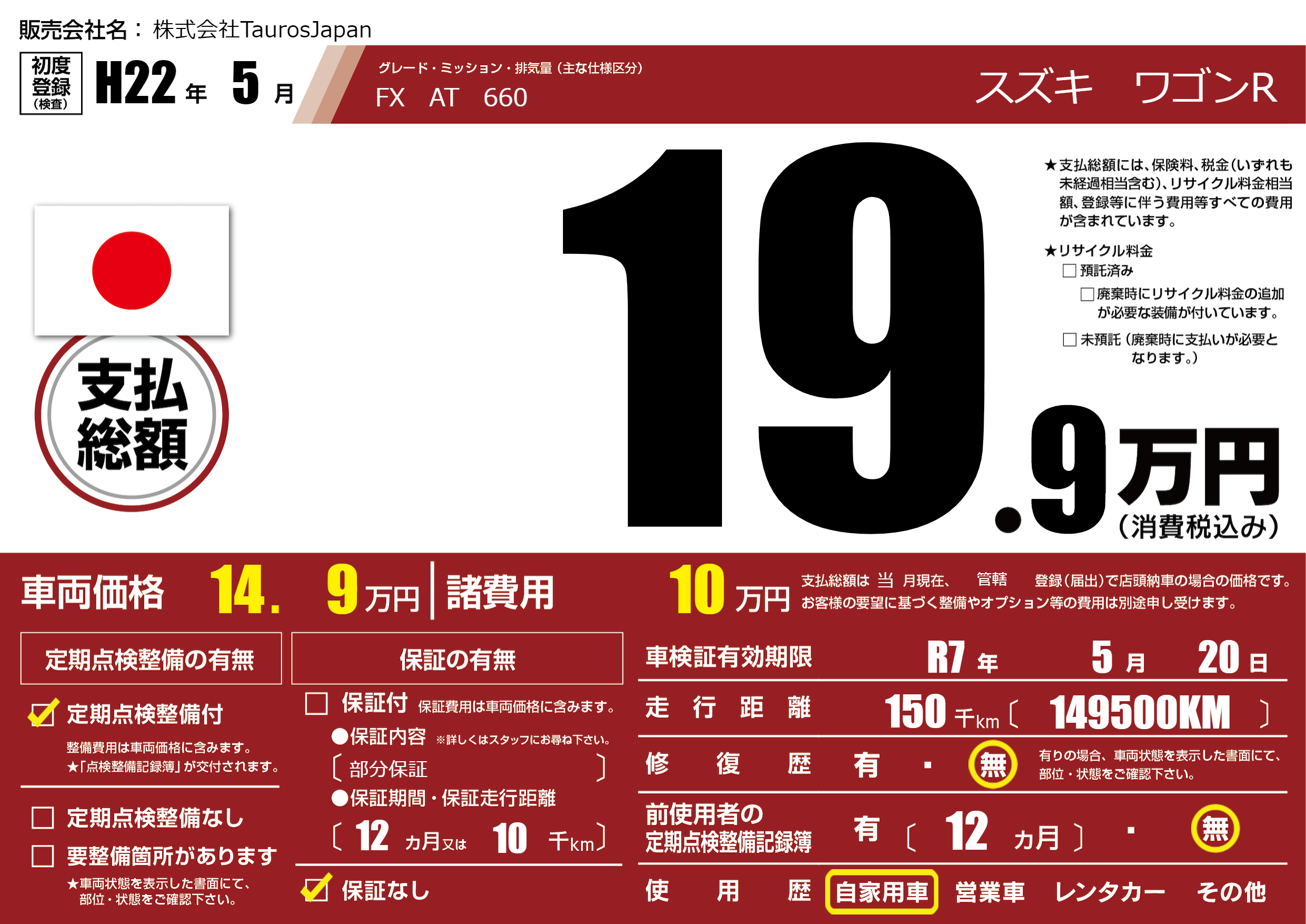 なし | 車検制限 | R7年5月20月 |