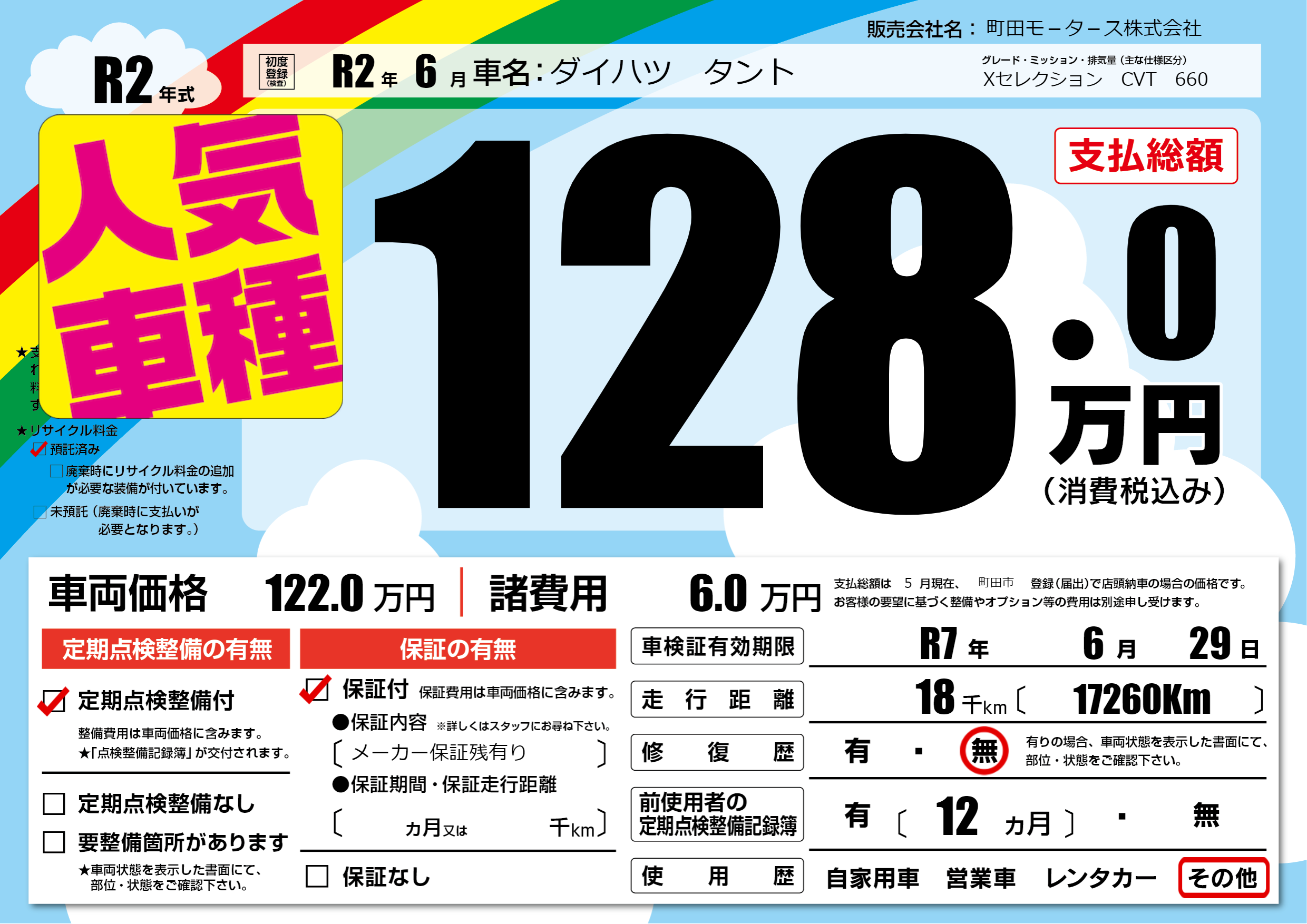 | 車名 | ダイハツ タント | グレード ミッション 排気量 |
