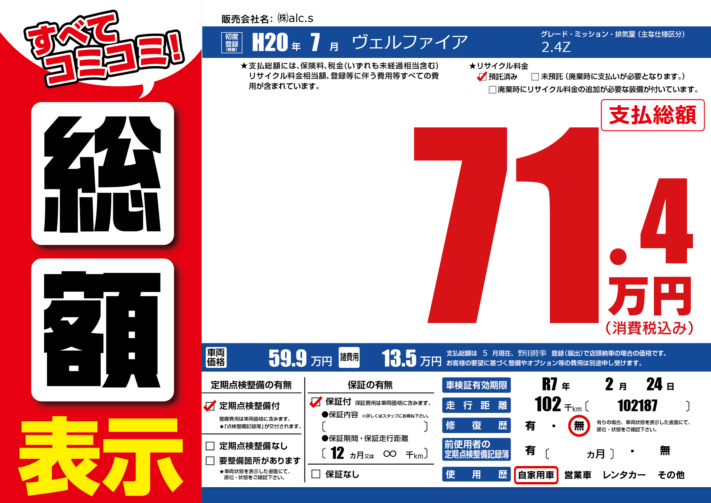 | 走行キロ | 10.2万km | 初年度登録 | H20年7月 |