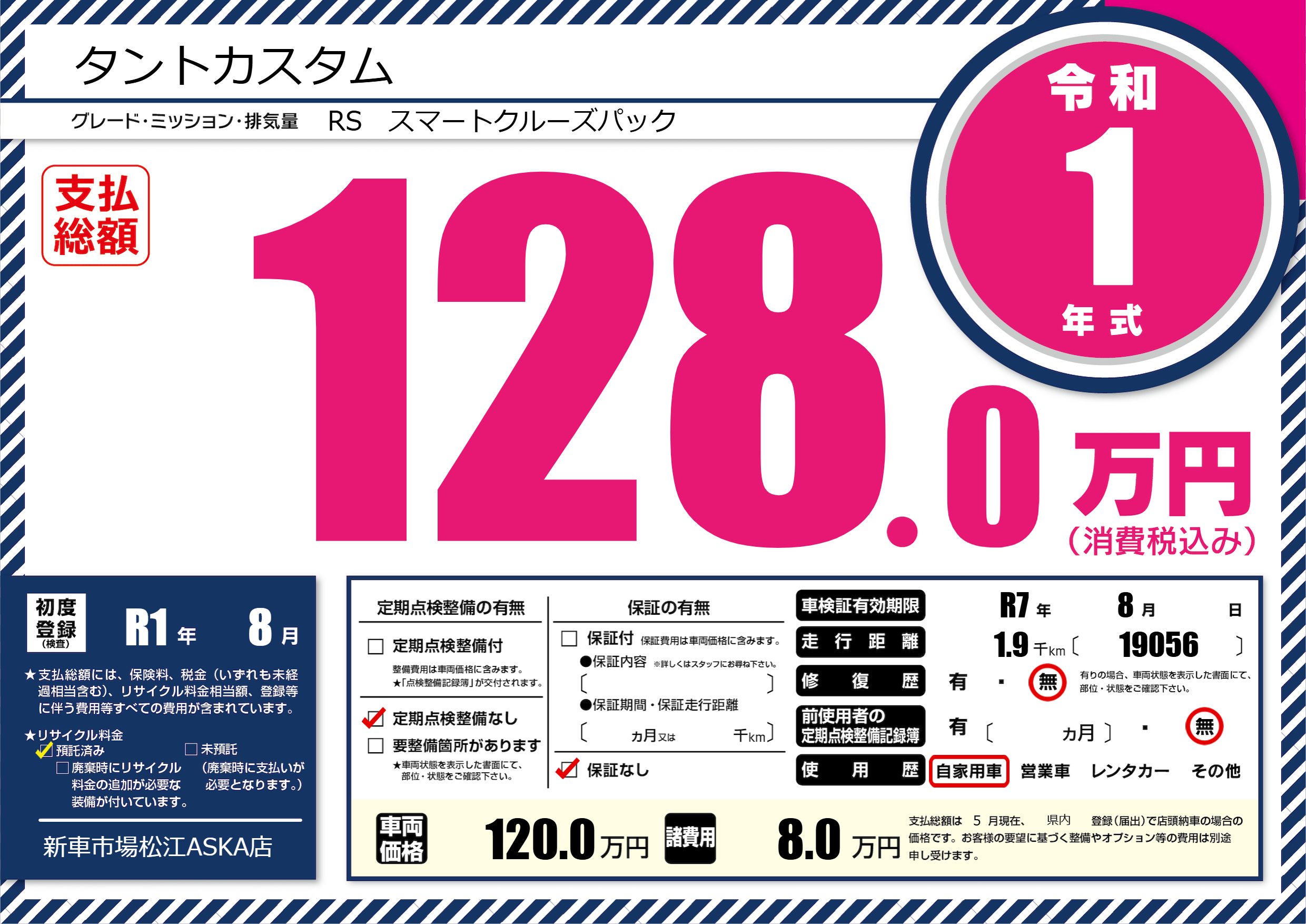 | 走行キロ | 0.1万km | 初年度登録 | R1年8月 |