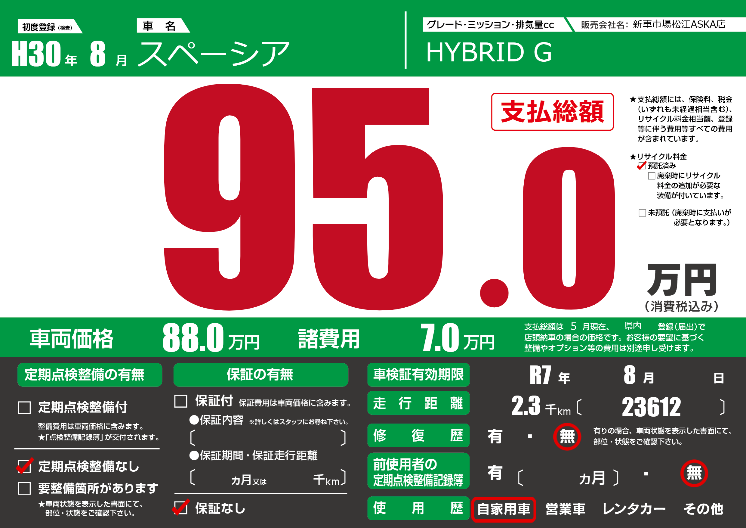 | 車名 | スペーシア | グレード ミッション 排気量 |