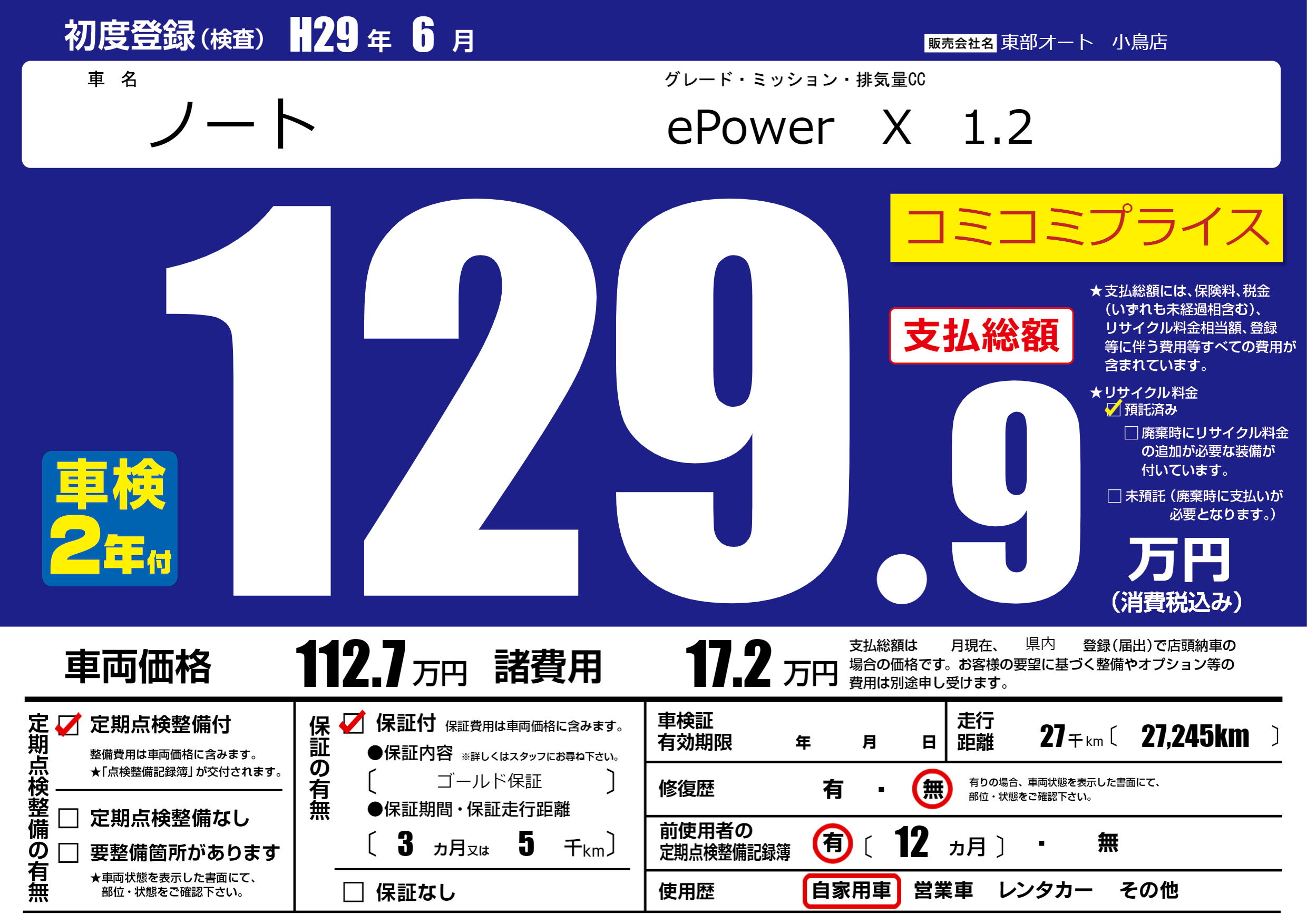 | 走行キロ | 2.7万km | 初年度登録 | H29年6月 |