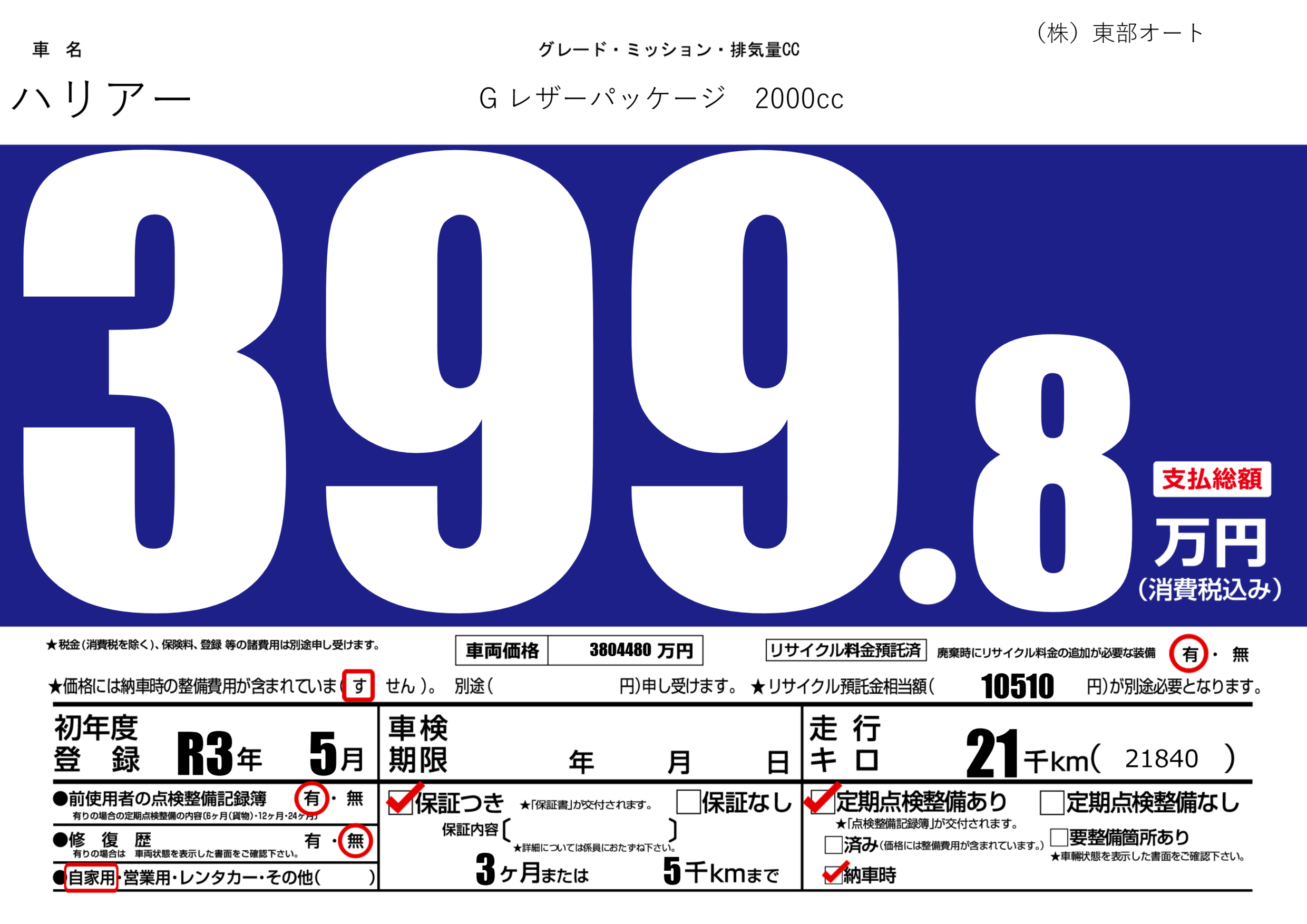 保証付き 保証内容(---) 3ヶ月または(5)千kmまで |