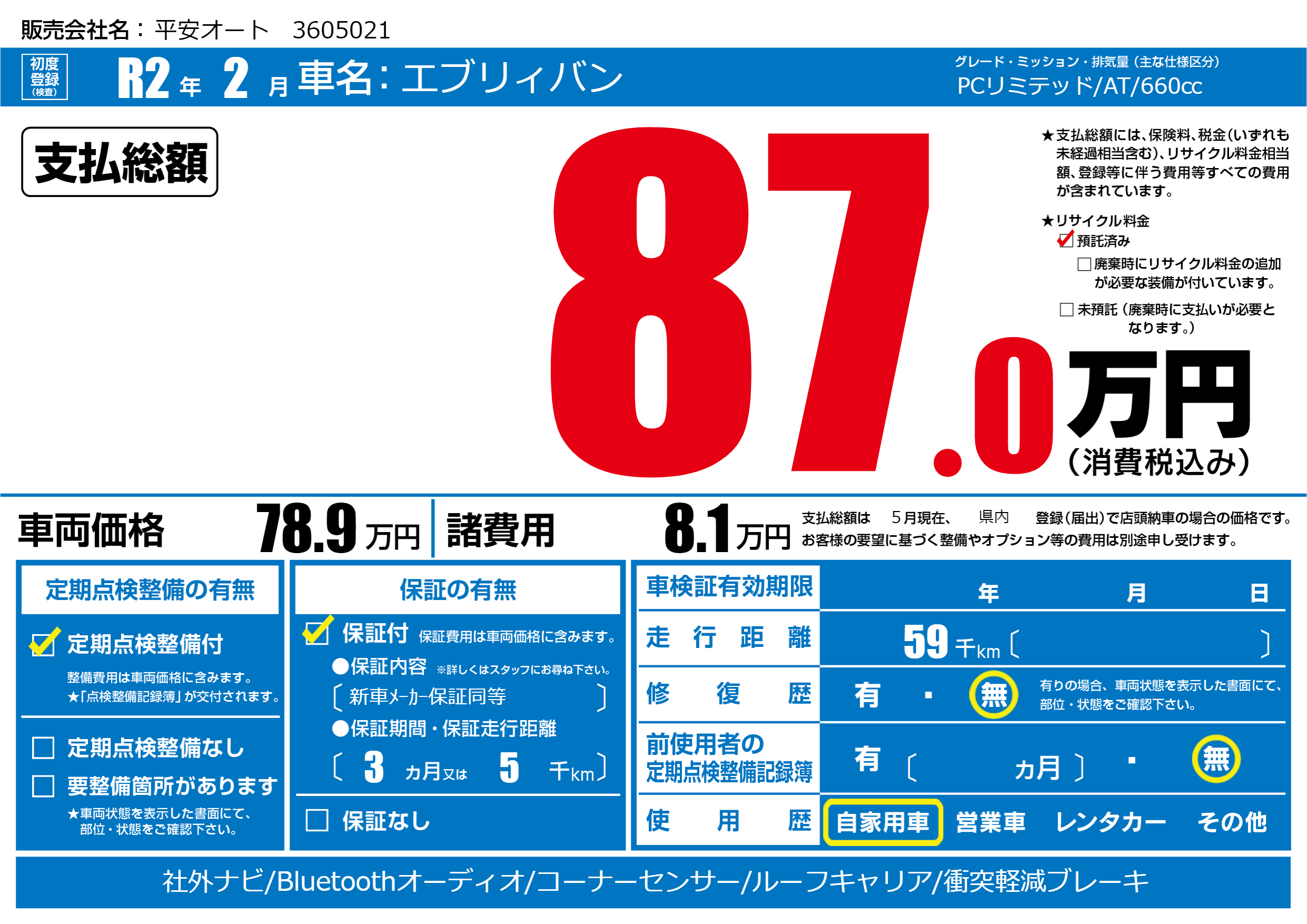 | 車検制限 | - 年 - 月 - 日 | ||