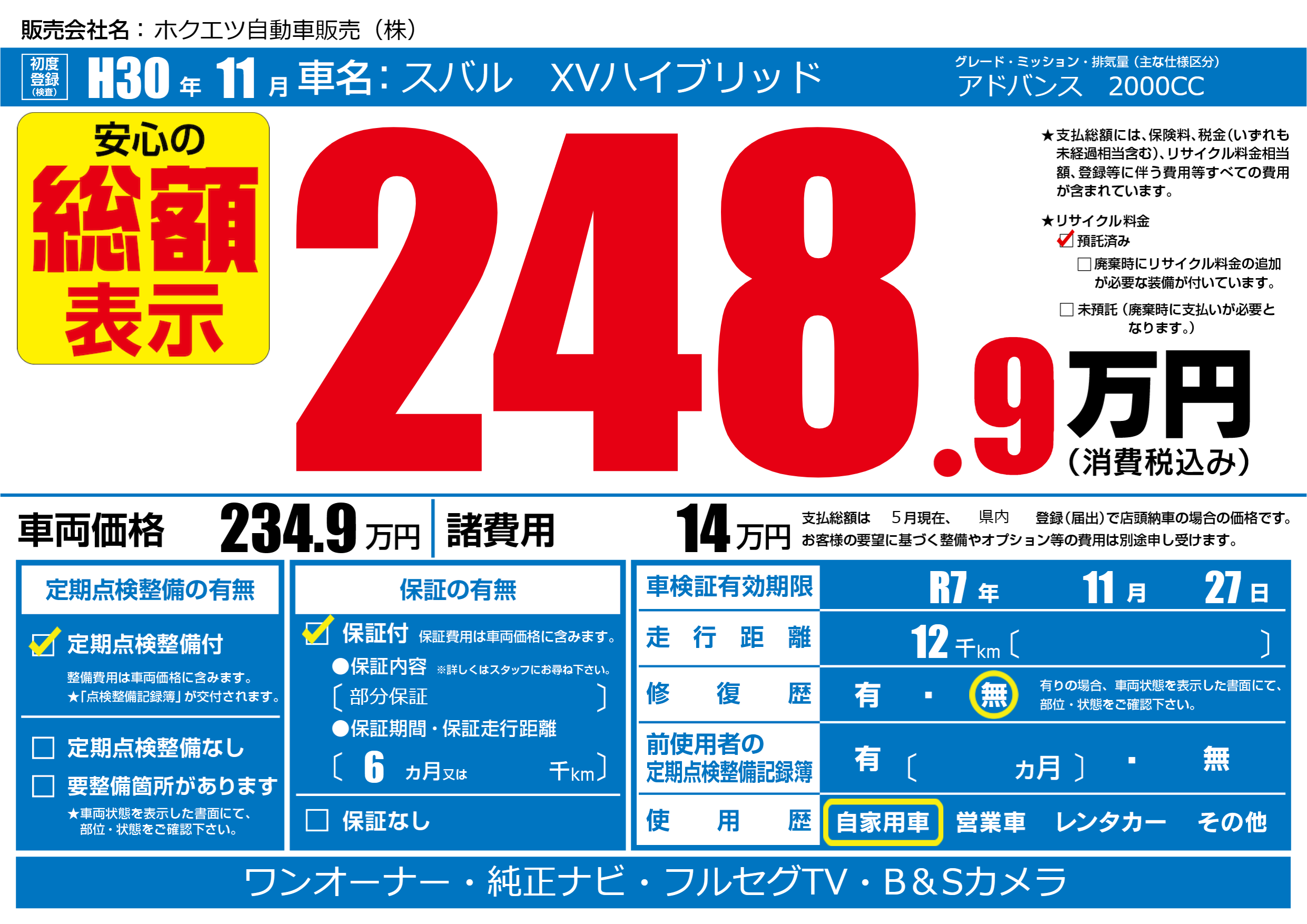 | 車名 | スバル XVハイブリッド | グレード ミッション 排気量 |