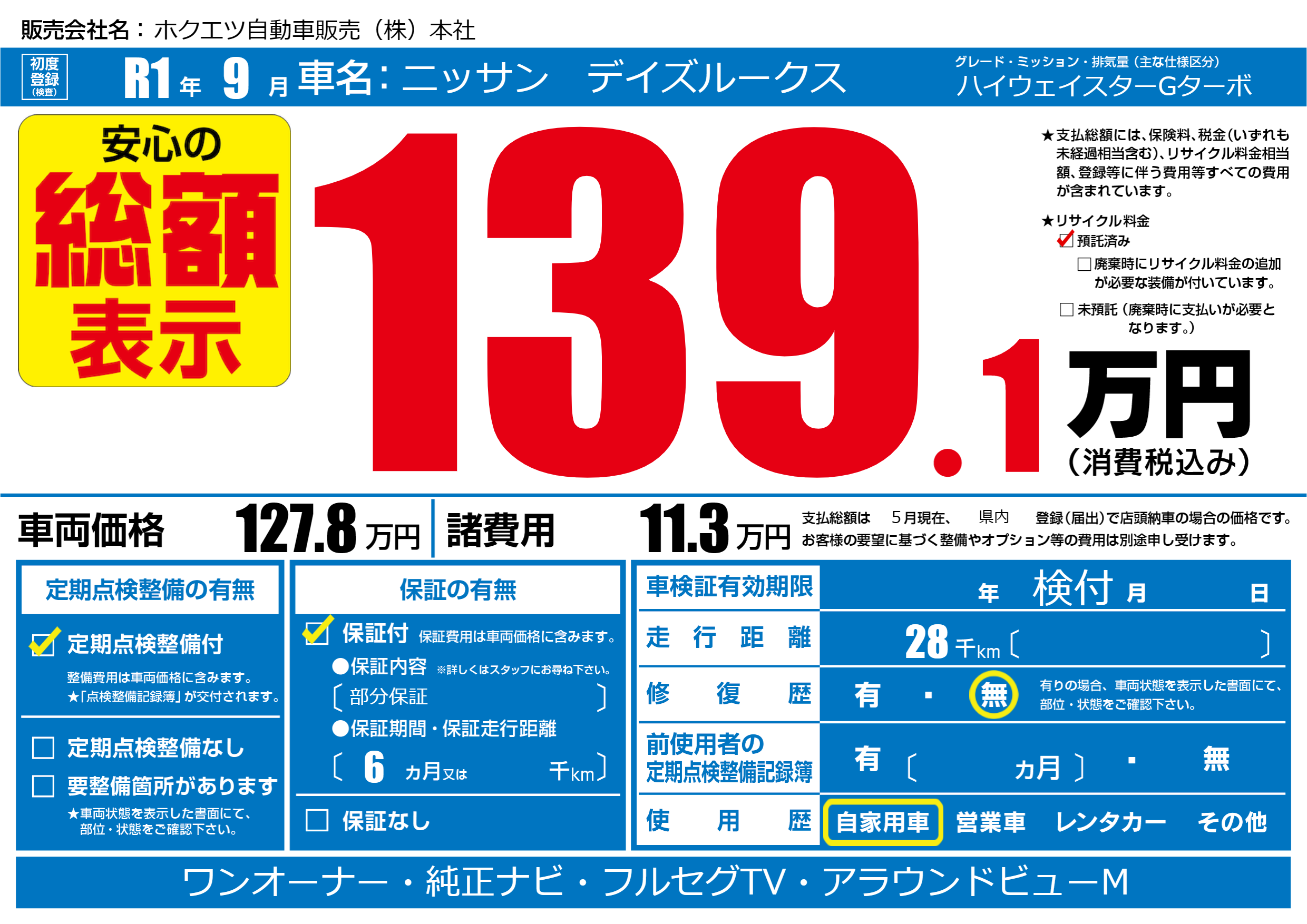 | 車名 | ニッサン デイズルークス | グレード ミッション 排気量 |