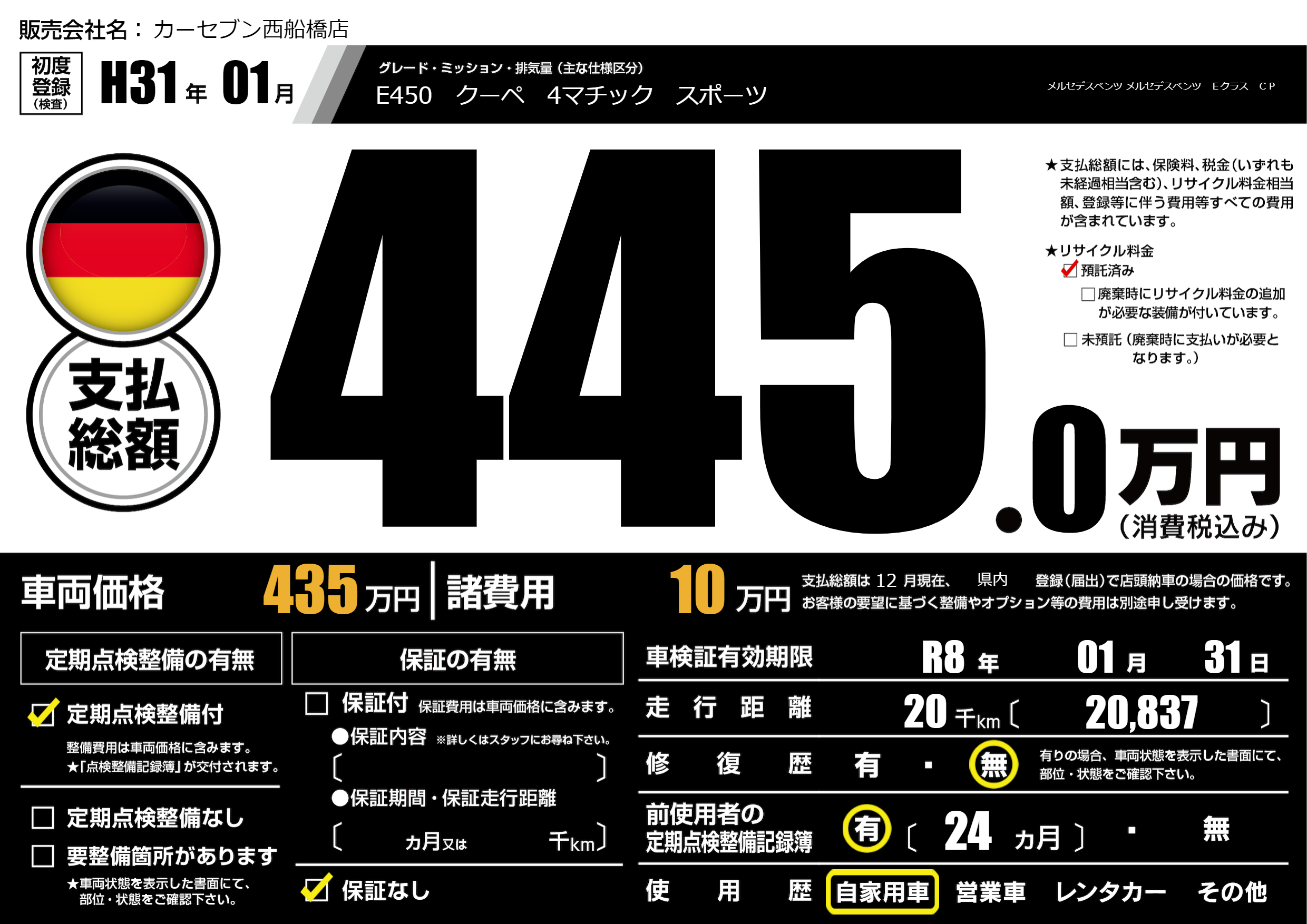 | 車名 | メルセデスベンツ メルセデスベンツ Eクラス CP | グレード ミッション 排気量 |