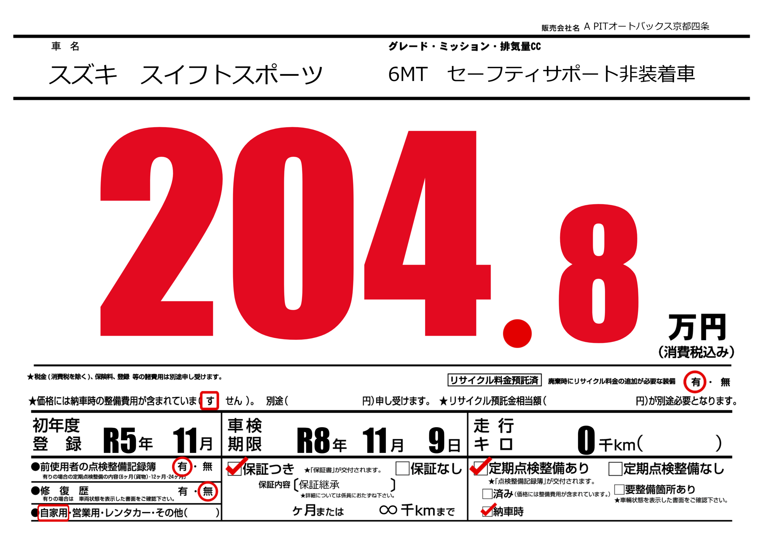 | 車名 | スズキ スイフトスポーツ | グレード ミッション 排気量 |