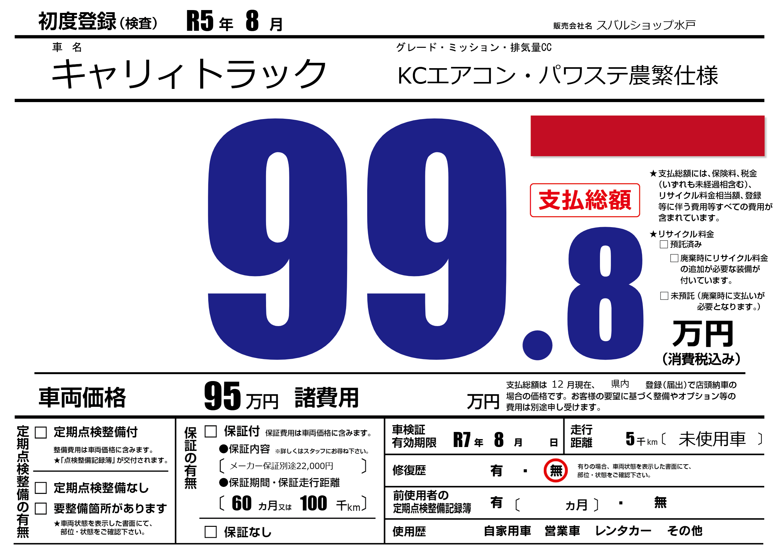 保証なし 保証内容(メーカー保証別途22,000円) 60ヶ月または(100)千kmまで |