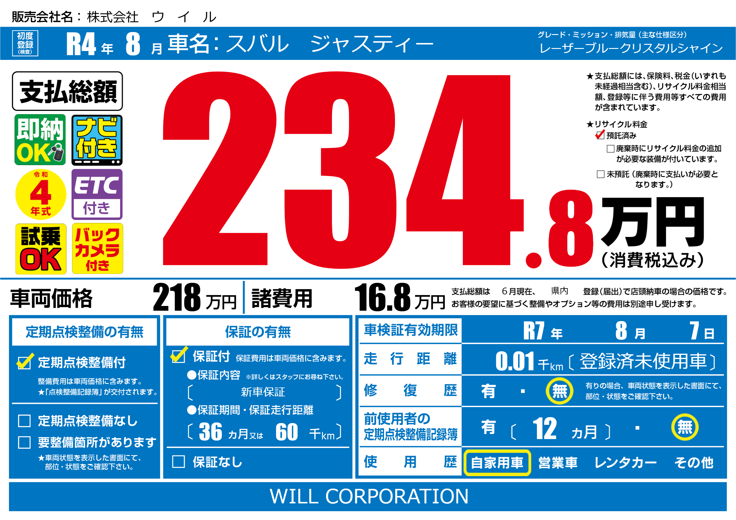 | 車名 | スバル ジャスティー | グレード ミッション 排気量 |