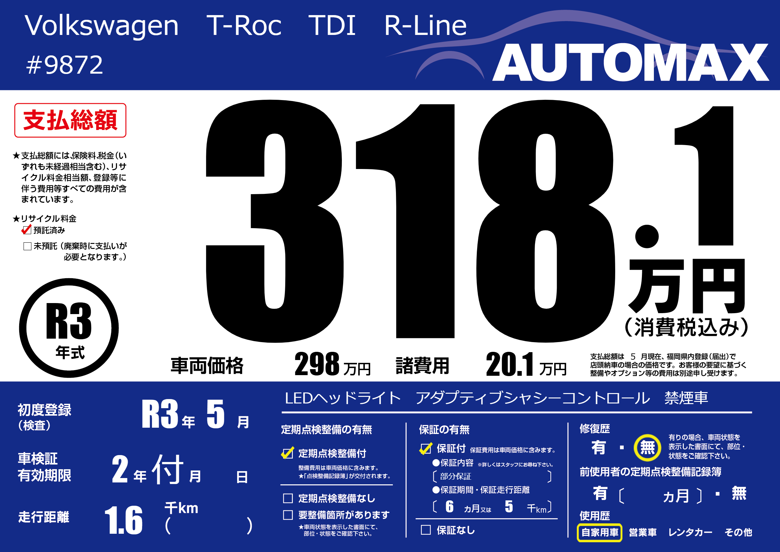| 車名 | Volkswagen T-Roc TDI R-Line | グレード ミッション 排気量 |