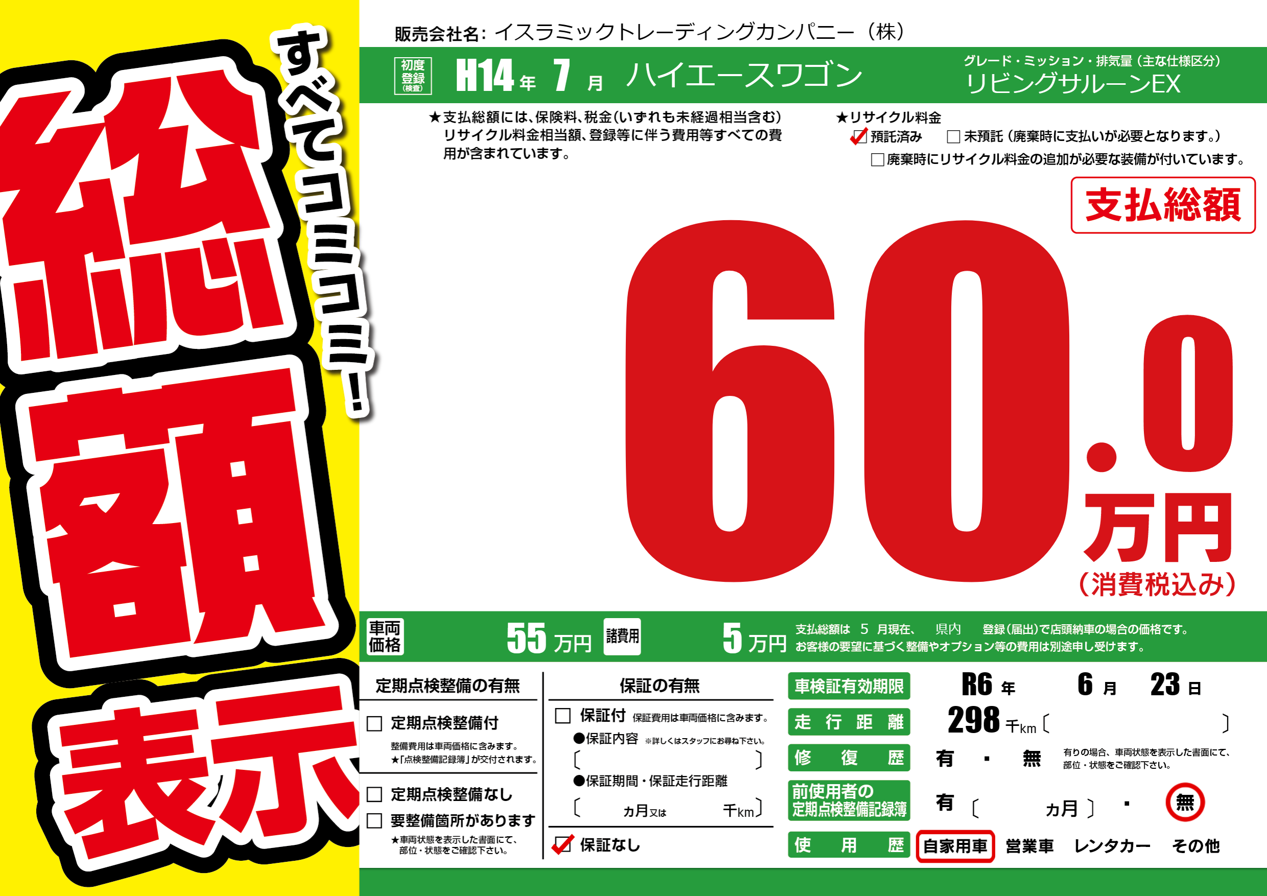 | 車名 | ハイエースワゴン | グレード ミッション 排気量 |