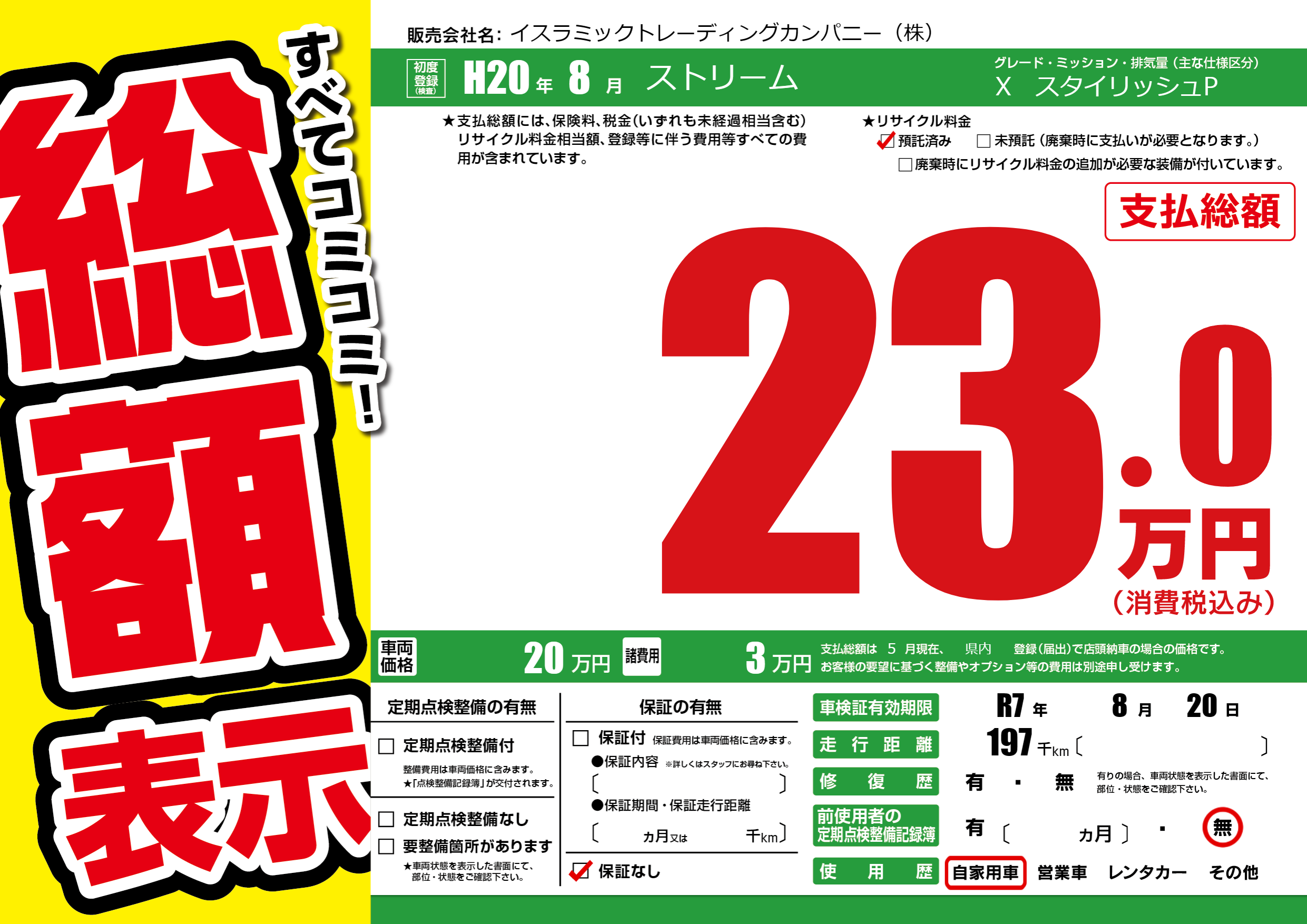 | 走行キロ | 19.7万km | 初年度登録 | H20年8月 |