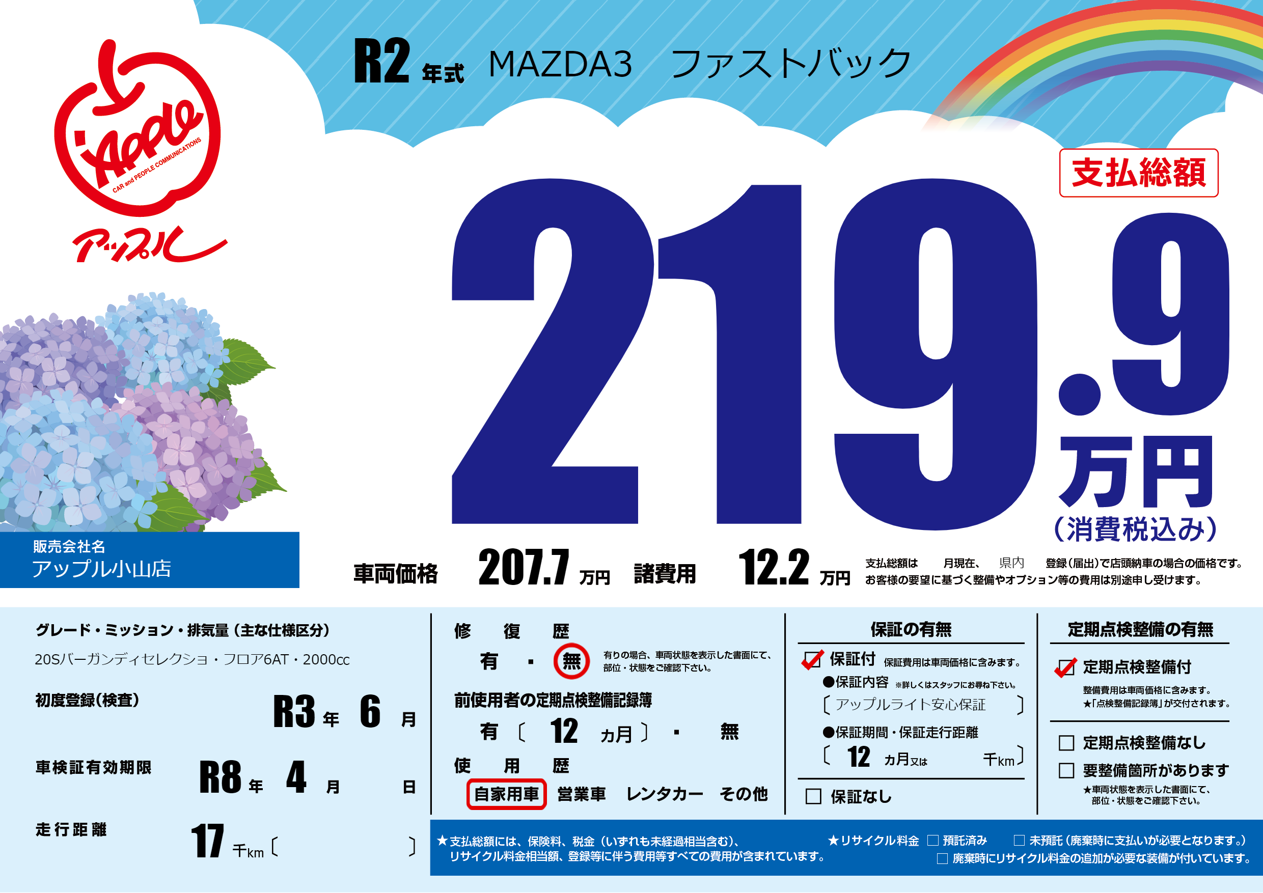 保証付き 保証内容(アップルライト安心保証) 12ヶ月または千km |