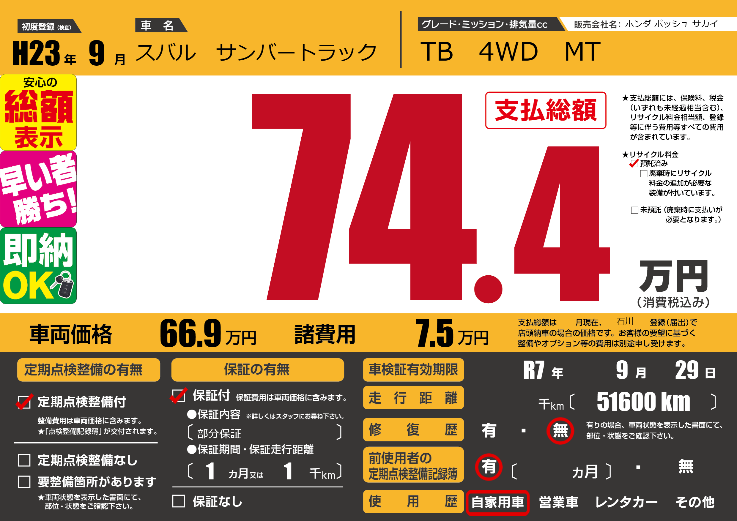 | 車名 | スバル サンバートラック | グレード ミッション 排気量 |