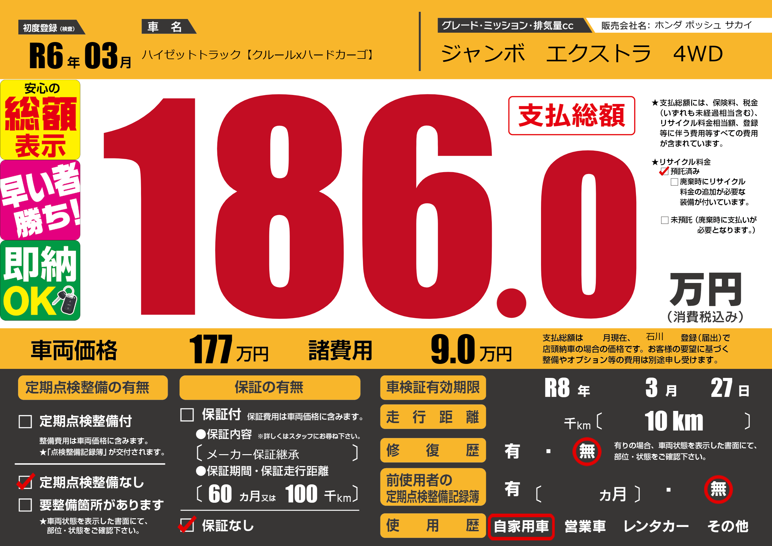 | 走行キロ | - | 初年度登録 | R6年03月 |