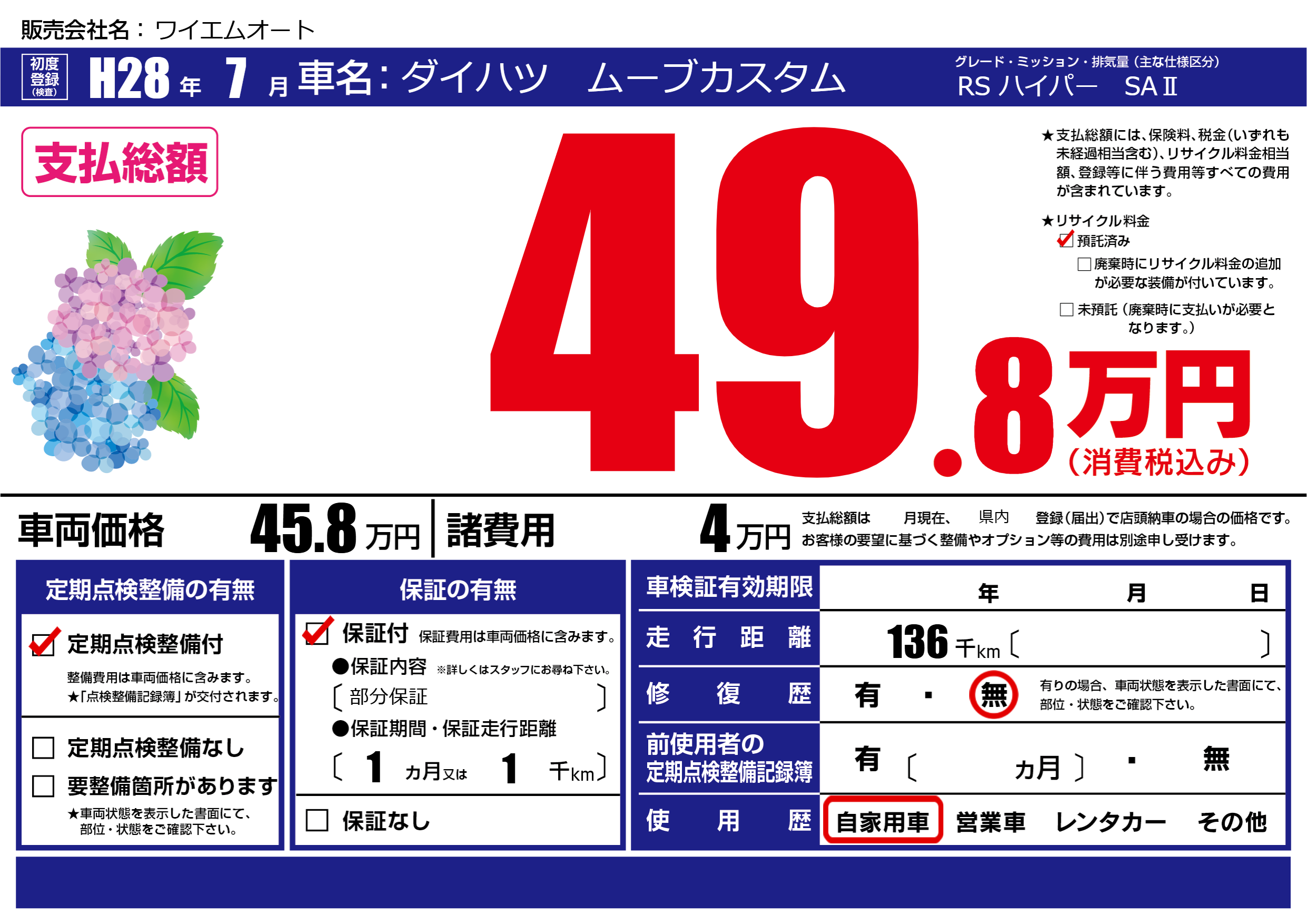 | 走行キロ | 13.6万km | 初年度登録 | H28年7月 |