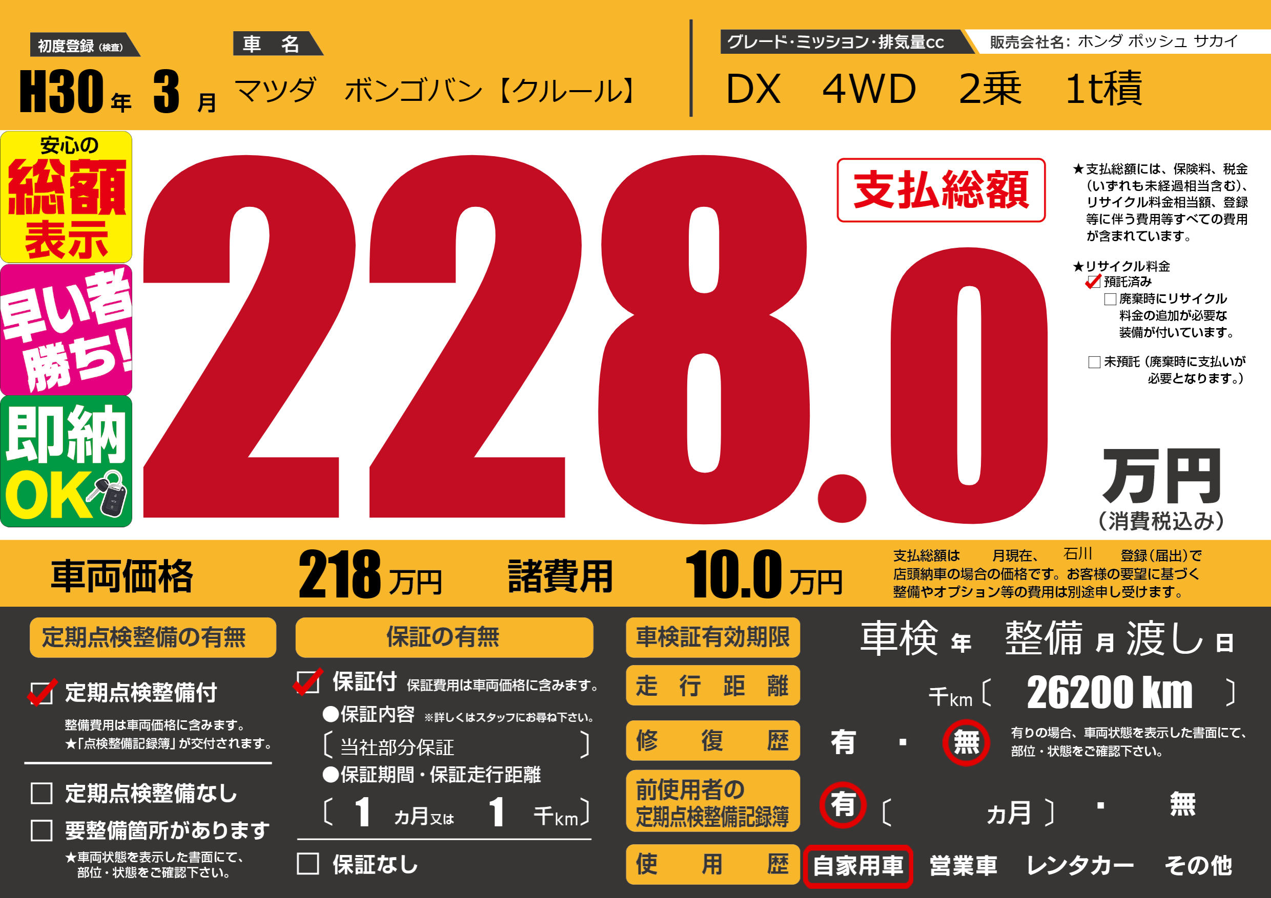 | 走行キロ | - | 初年度登録 | H30年3月 |