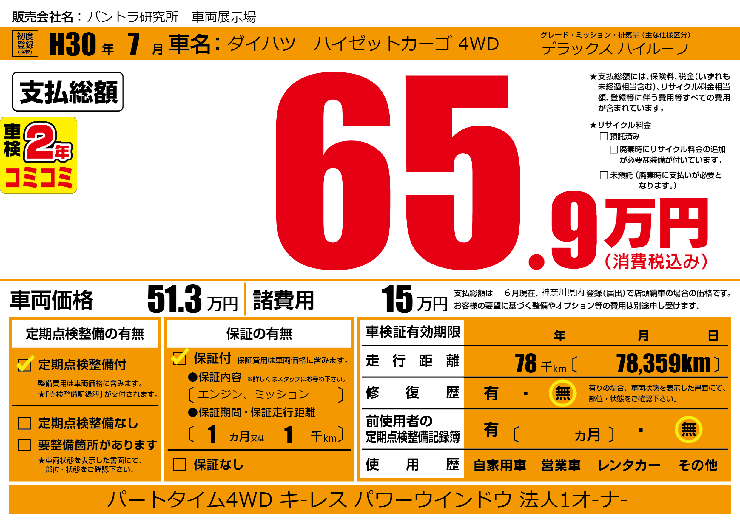| 車名 | ダイハツ ハイゼットカーゴ 4WD | グレード ミッション 排気量 |