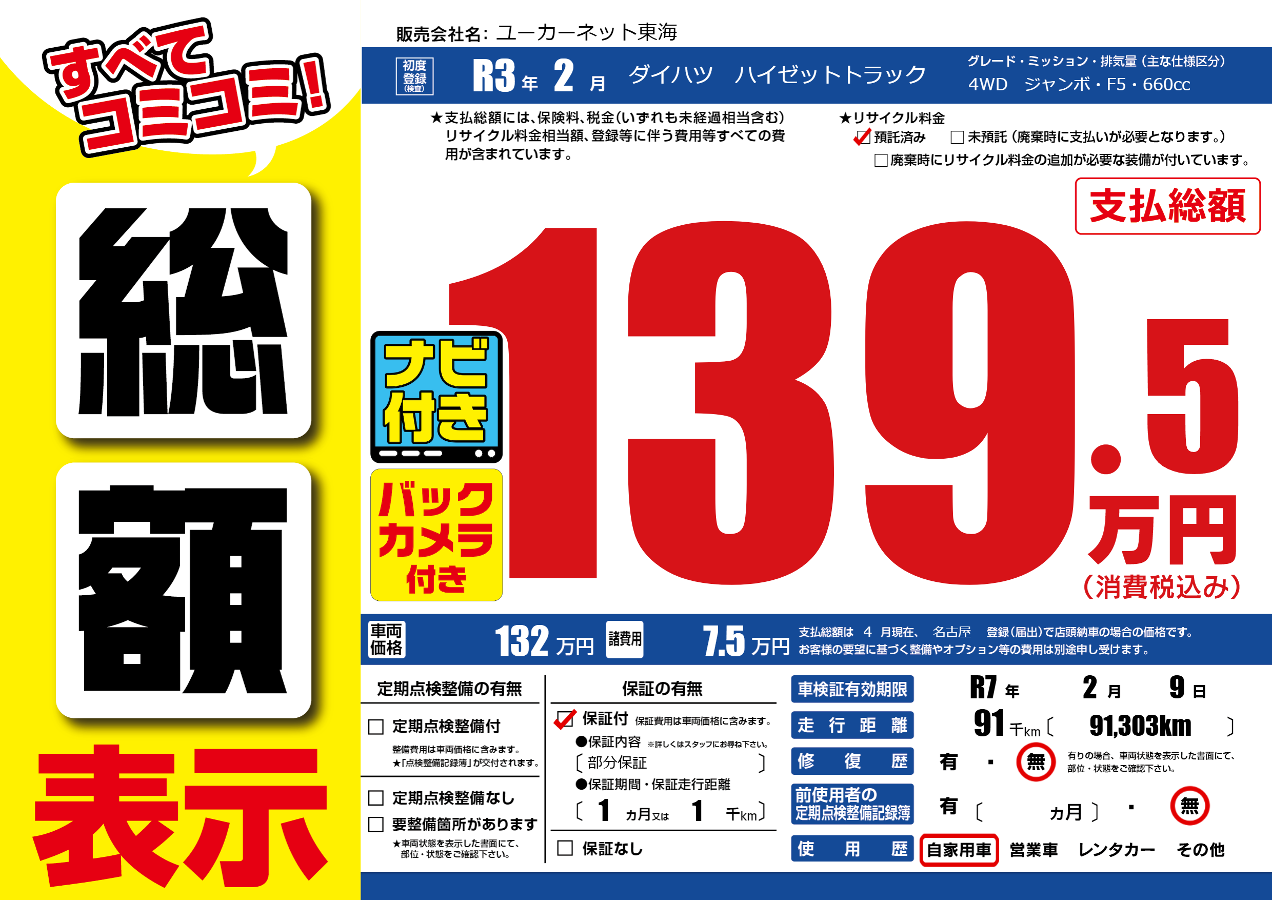 | 走行キロ | 9.1万km | 初年度登録 | R3年2月 |