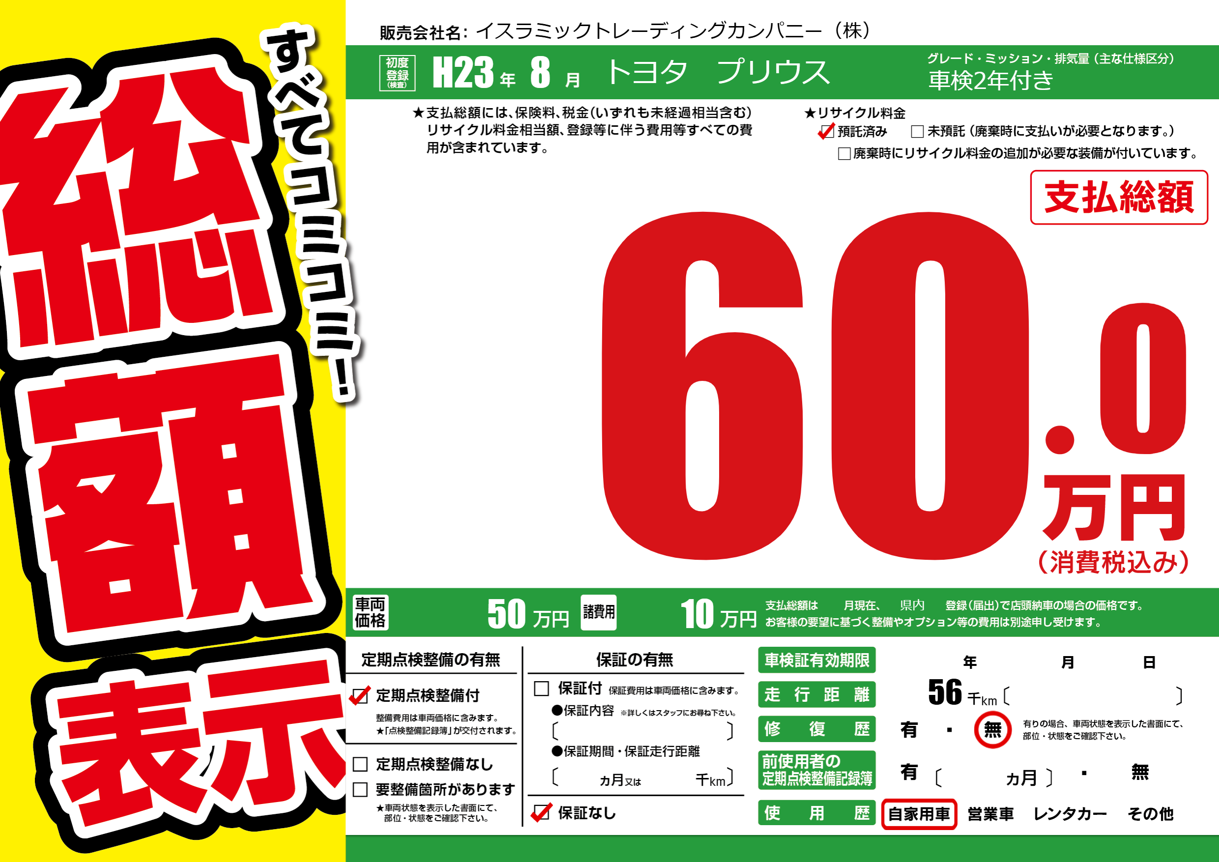 | 車名 | トヨタ プリウス | グレード ミッション 排気量 |