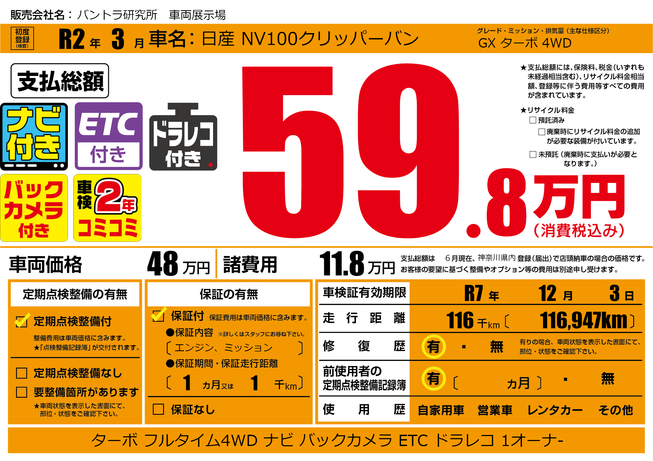| 車名 | 日産 NV100クリッパーバン | グレード ミッション 排気量 |
