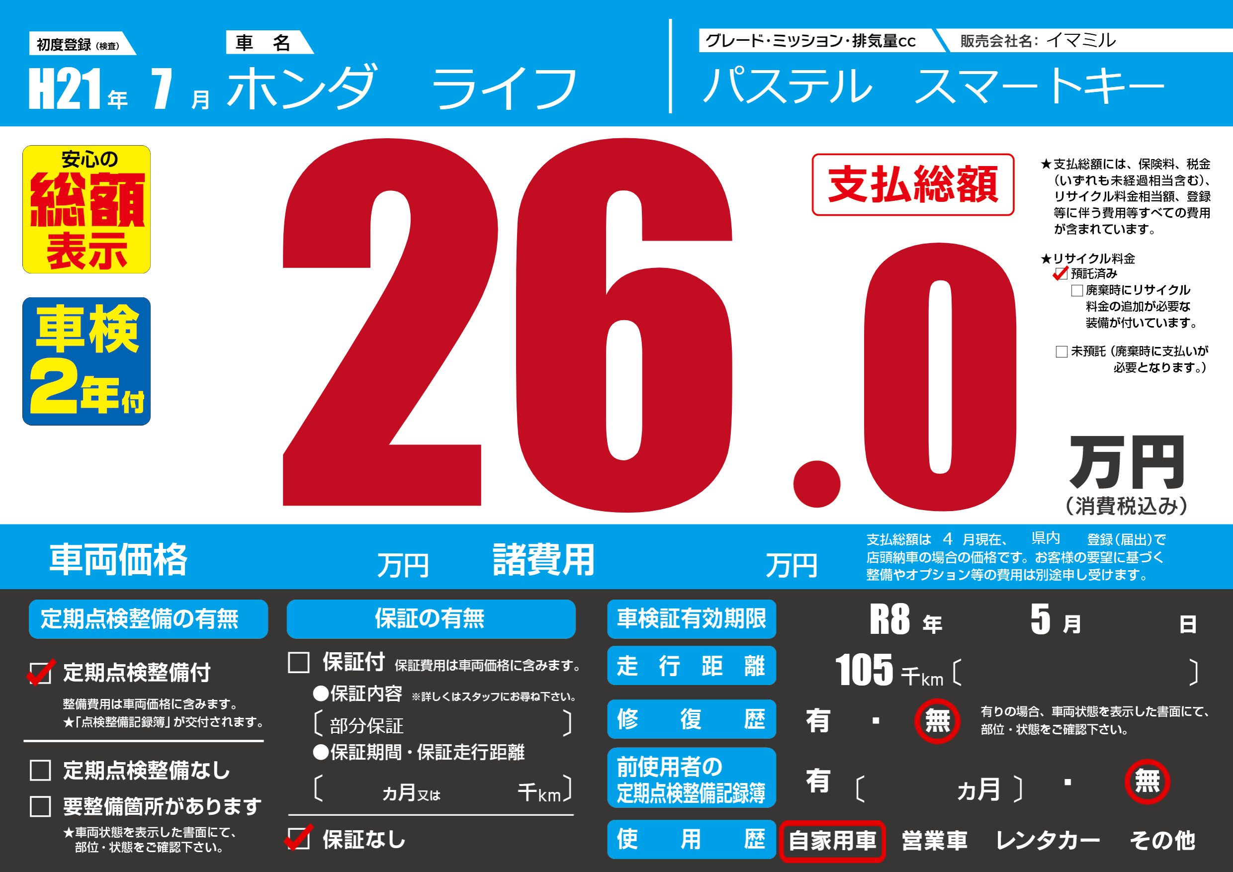 | 走行キロ | 10.5万km | 初年度登録 | H21年7月 |