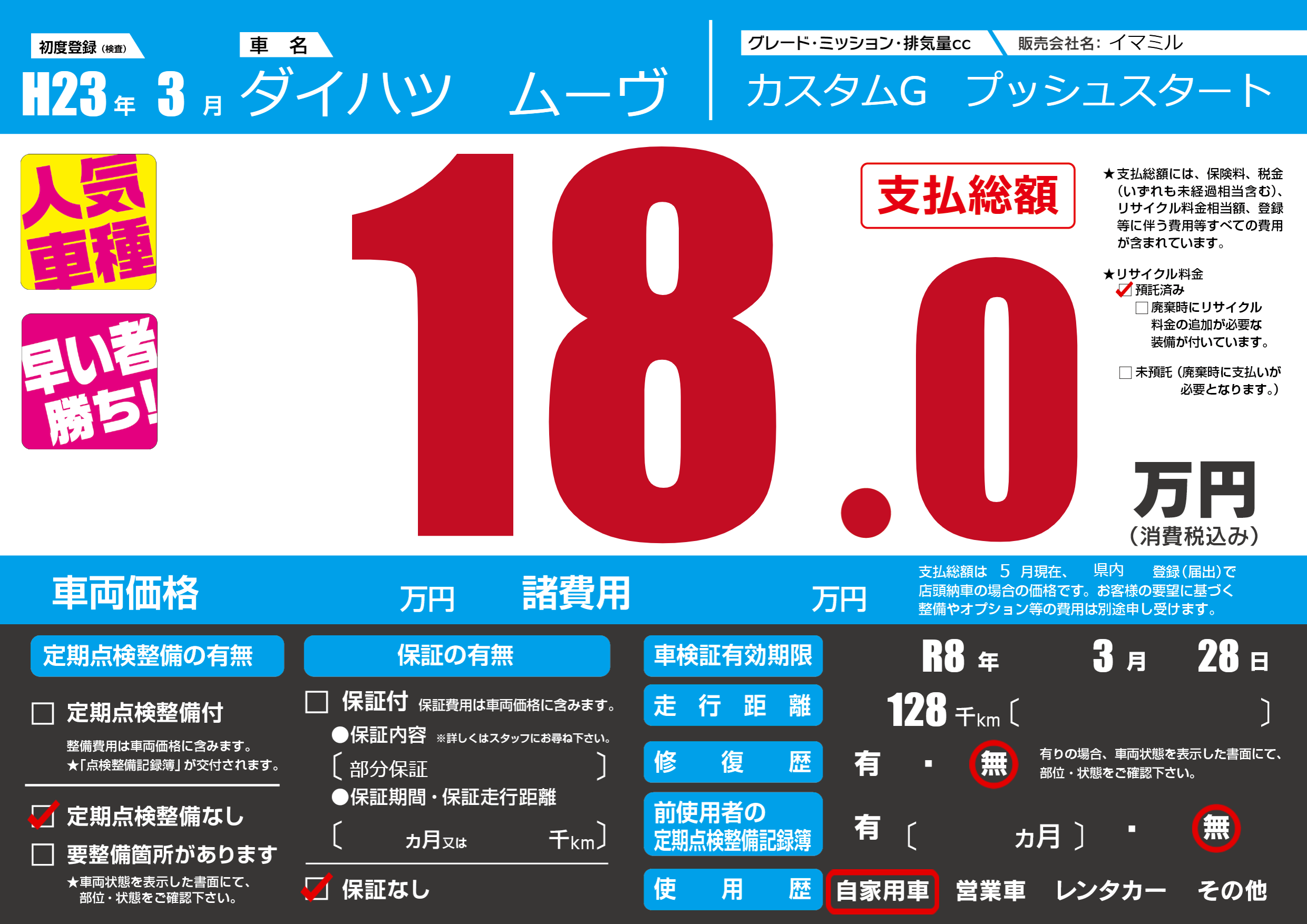| 走行キロ | 12.8万km | 初年度登録 | H23年3月 |