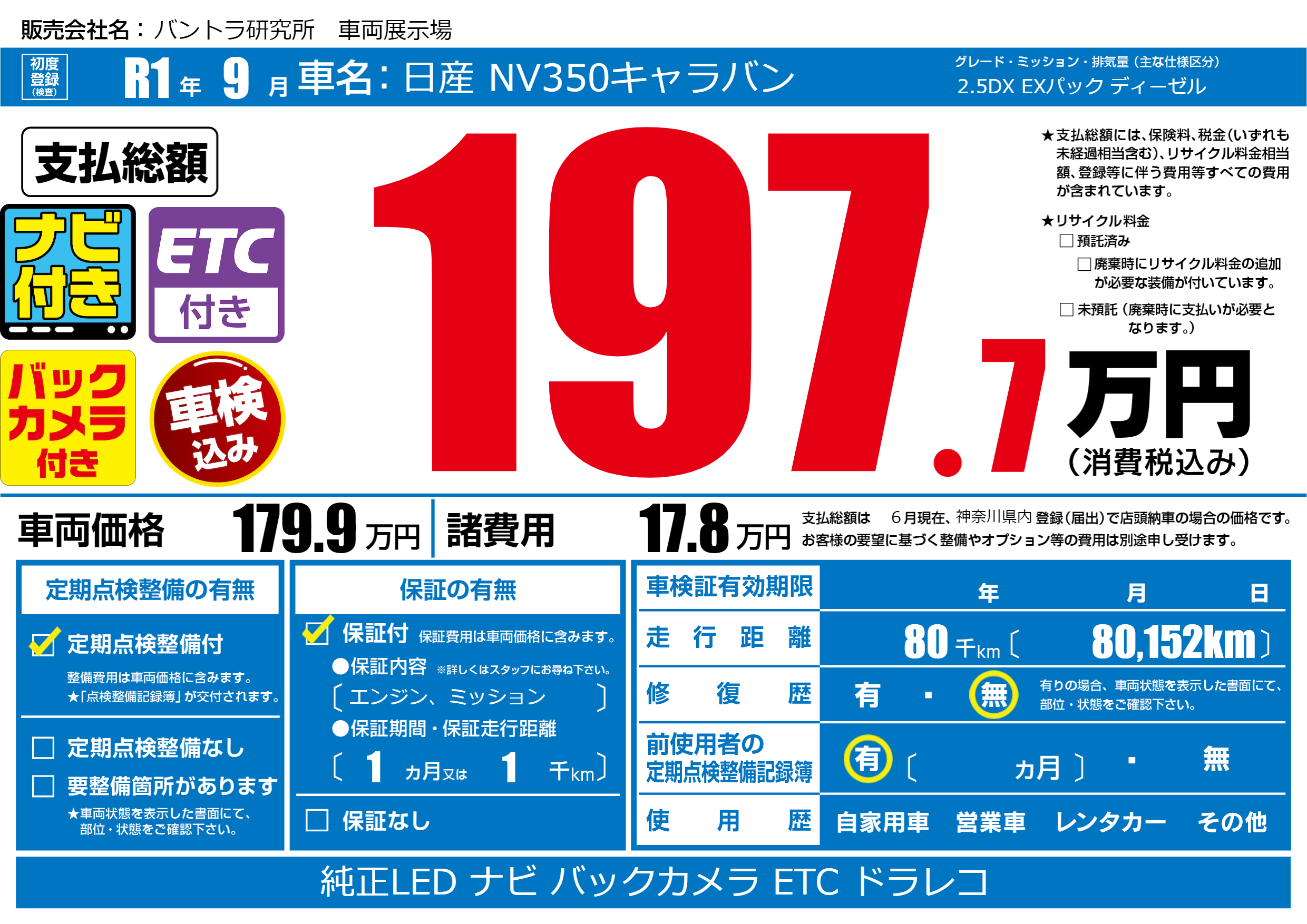 | 車名 | 日産 NV350キャラバン | グレード ミッション 排気量 |