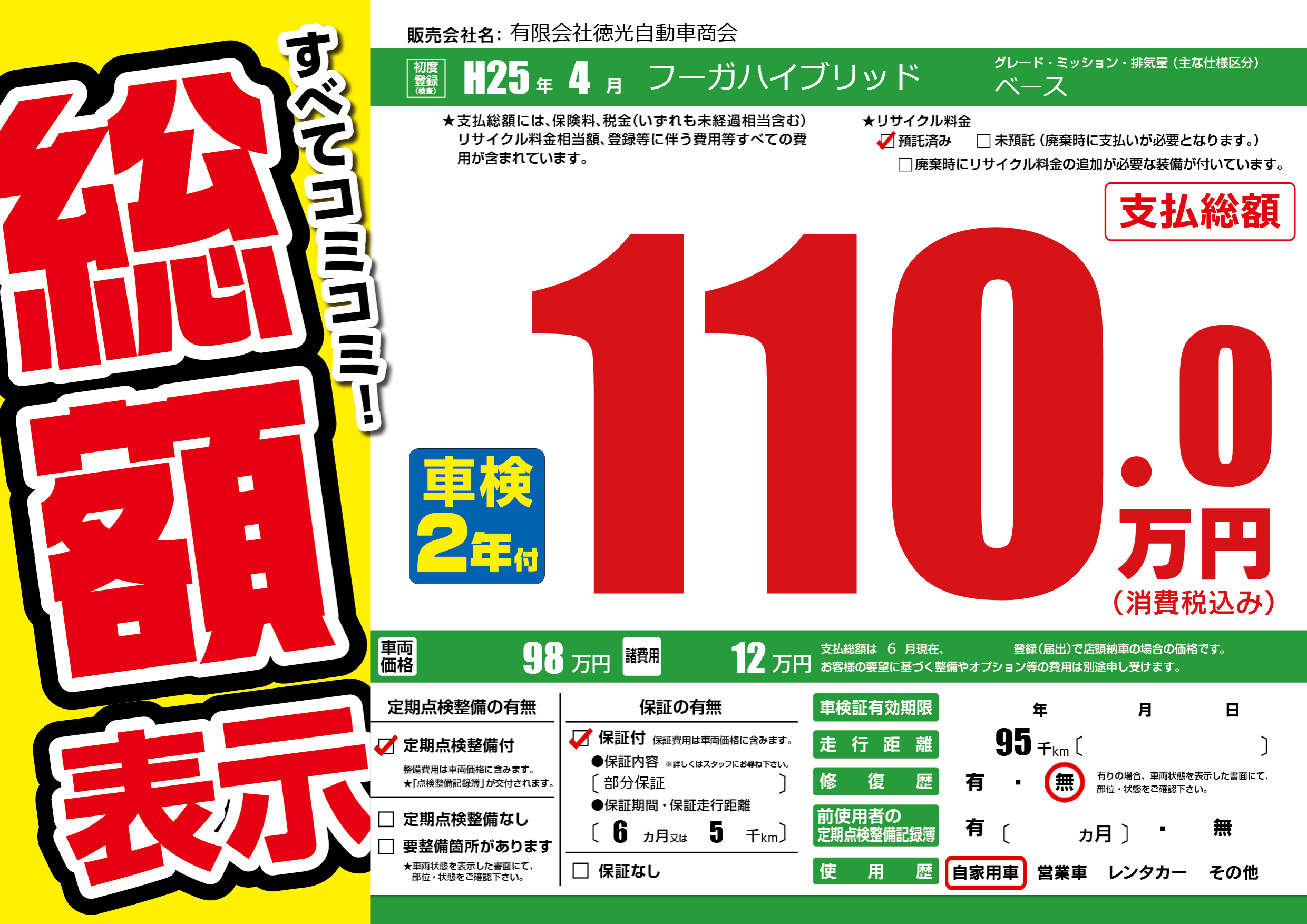 | 走行キロ | 9.5万km | 初年度登録 | H25年4月 |
