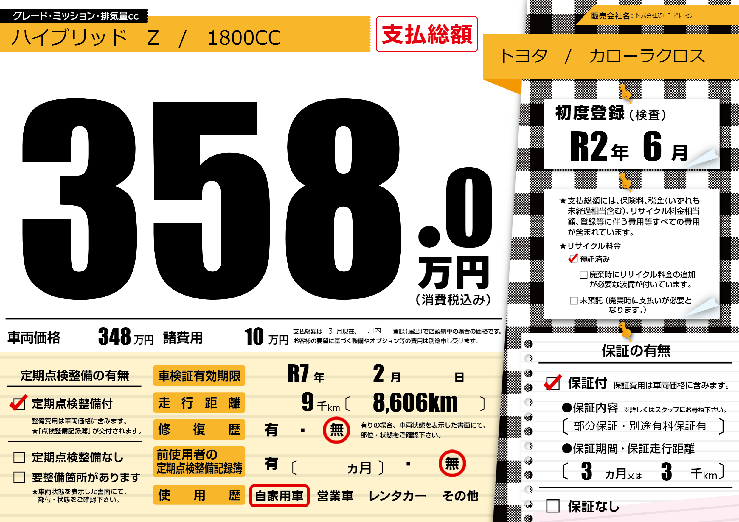 | 走行キロ | 0.9万km | 初年度登録 | R2年6月 |