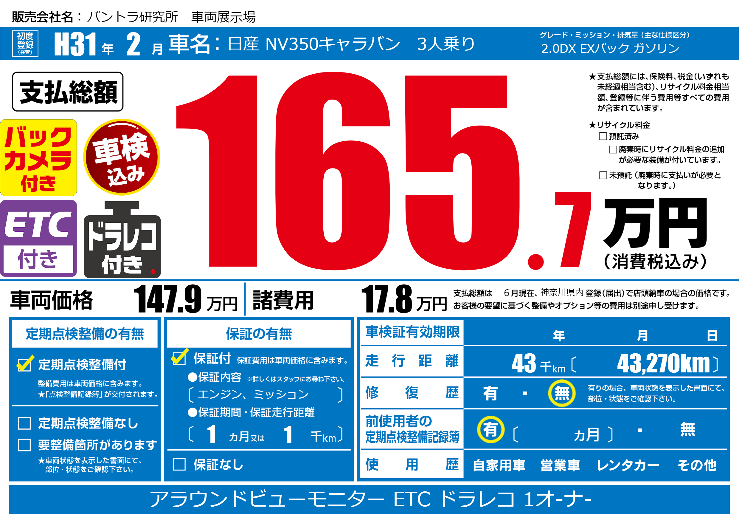 | 車名 | 日産 NV350キャラバン 3人乗り | グレード ミッション 排気量 |
