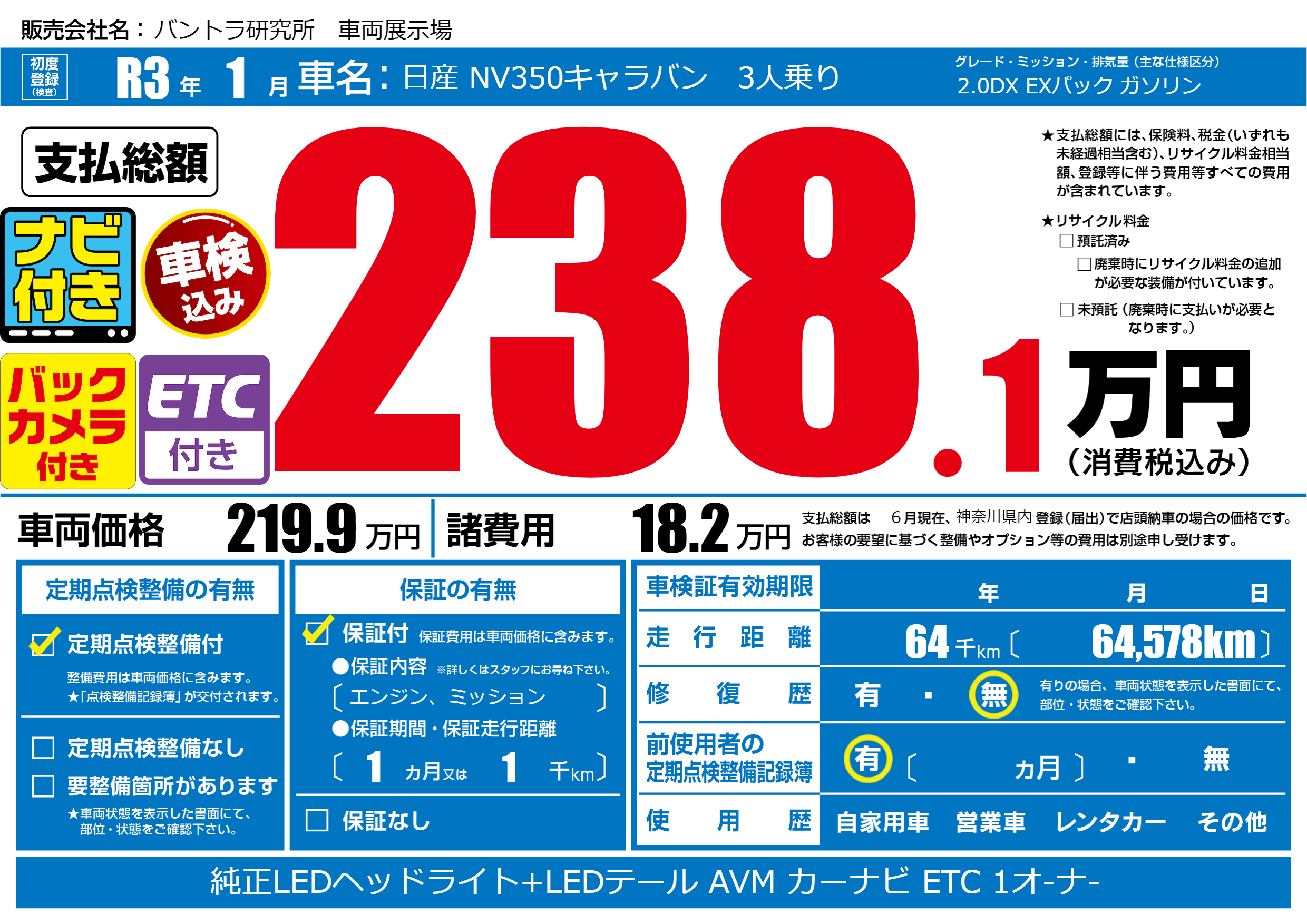 | 車名 | 日産 NV350キャラバン 3人乗り | グレード ミッション 排気量 |