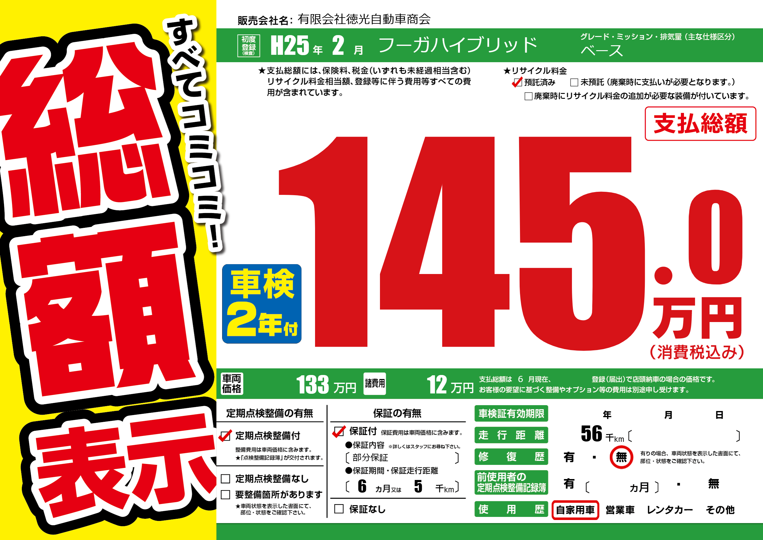 | 走行キロ | 5.6万km | 初年度登録 | H25年2月 |