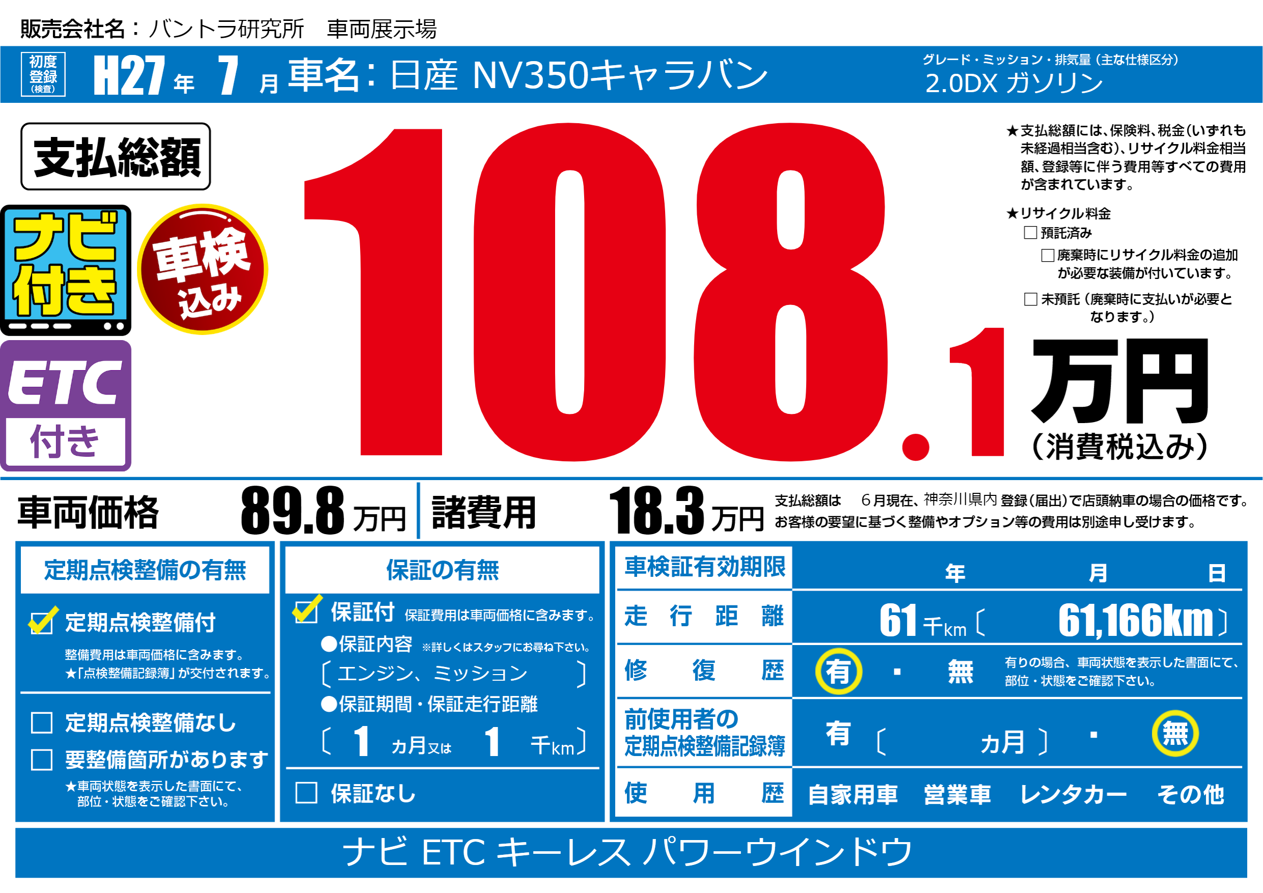 | 車名 | 日産 NV350キャラバン | グレード ミッション 排気量 |